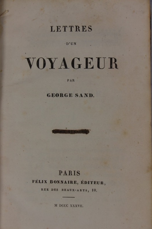 Paris, Félix Bonnaire 1837 Deux volumes reliés en un in-8, demi-basane,, dos lisse, filets dorés et à froid, 422- 414 pp. Une étiquette de classement au dos, mors fendillés en tête et en pied, coins et coupes usés. Rares rousseurs. Edition originale de cet important recueil de douze lettres, datées du 15 mai 1834 au 29 mai 1836, les trois premières inspirées par la relation orageuse de George Sand avec Alfred de Musset. Formant les XV & XVI volumes des Oeuvres complètes.