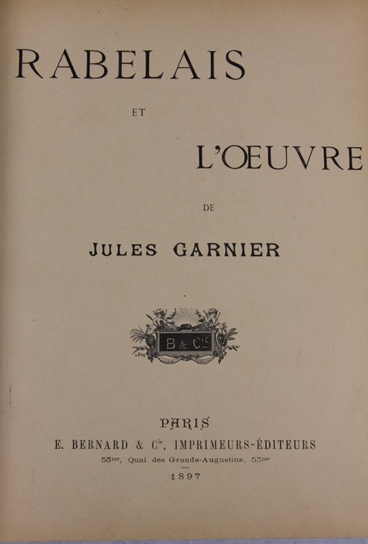 Garnier, Jules E. Bernard et Cie 27 x 33 Paris 1897 Fort in-folio, reliure demi-chagrin fauve à coin, dos à cinq nerfs, titre doré, tête dorée, 300 p., 160 illustrations en couleurs, montées sur onglet, avant propos d'Armand Sylvestre. Textes sur deux colonnes de Gargantua et Pantagruel. Illustrations du peintre Jules Garnier (1847-1889) fidèles à l'esprit de provocation de Rabelais, passèrent pour subversives. Belle reliure, coins émoussés, petite trace de vers sur les 10 premières pages sans conséquences, papier un peu jauni. Bon exemplaire.(ApC131) Livre