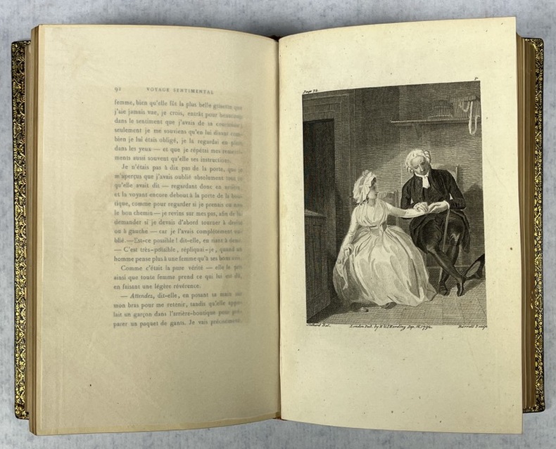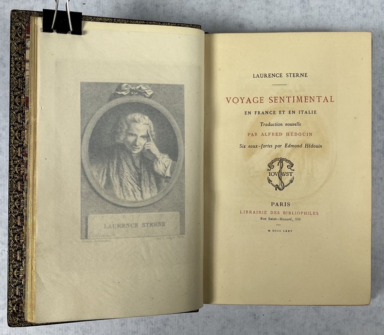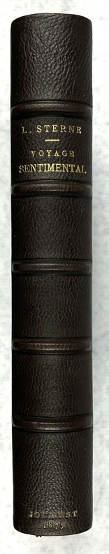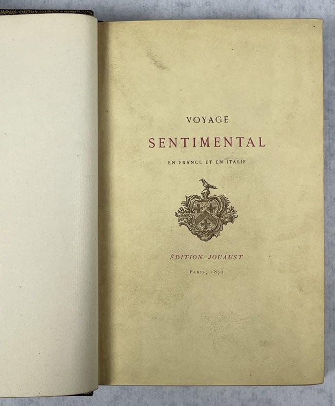 vol. in folio, 300x200, relié demi chagrin cuir, frottements et accrocs, couvertures conservées, très bel état intérieur, 212pp H. Launette éditeur 1884 librairie artistique Le Voyage sentimental à travers la France et l'Italie est un roman de l'écrivain irlandais Laurence Sterne, écrit et publié pour la première fois en 1768, alors que Sterne va bientôt mourir. En 1765, Sterne voyage à travers la France et l'Italie, poussant jusqu'à Naples et, à son retour, décide de décrire son voyage dans une optique « sentimentale ». Le roman jouit d'un très grand succès et d'une très grande influence et contribua à faire du récit de voyage un des genres dominants de la seconde moitié du XVIIIe siècle. À la différence des récits précédents, qui cherchent à dispenser des connaissances objectives, Le Voyage sentimental insiste sur une approche subjective des goûts et sentiments personnels, des mœurs et des coutumes, au-delà du savoir classique. Au cours des années 1770, des femmes écrivains commencèrent à publier un nombre significatif de récits de « voyages sentimentaux ». Le style « sentimental » devint le mode d'expression favori de la littérature non officielle et du radicalisme politique.
