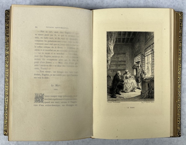 Traduction nouvelle. Précédé d'un essai sur la vie et le ouvrage de Sterne par M J JANIN. Edition illustrée par MM. TONY JOHANNOT et JACQUE. Paris, Ernest Bourdin, sans date (Circa 1841). 312 pages, 10 planches FORMAT: In-8 (16.5 x 25 cm) Reliure en demi-cuir (veau glacé). Dos lisse, doré du titre & de filets, ainsi que de de filets estampés à froid. Avec 10 gravures dessinées par Johannot tirées sur Chine et montées sur papier fort dont une en frontispice. Nombreuses vignettes gravées sur bois in-texte. Laurence Sterne (24 novembre 1713 Clonmel, Irlande - 18 mars 1768 Londres)fut un romancier et ecclésiastique britannique. Ses œuvres les plus célèbres sont The Life and Opinions of Tristram Shandy, Gentleman (Tristram Shandy), et A Sentimental Journey Through France and Italy (Voyage sentimental à travers la France et l'Italie) mais Sterne publia aussi des sermons, écrivit des mémoires et prit part à la vie politique locale. Il mourut à Londres après avoir combattu la tuberculose pendant de nombreuses années. POIDS: 1.1 kg