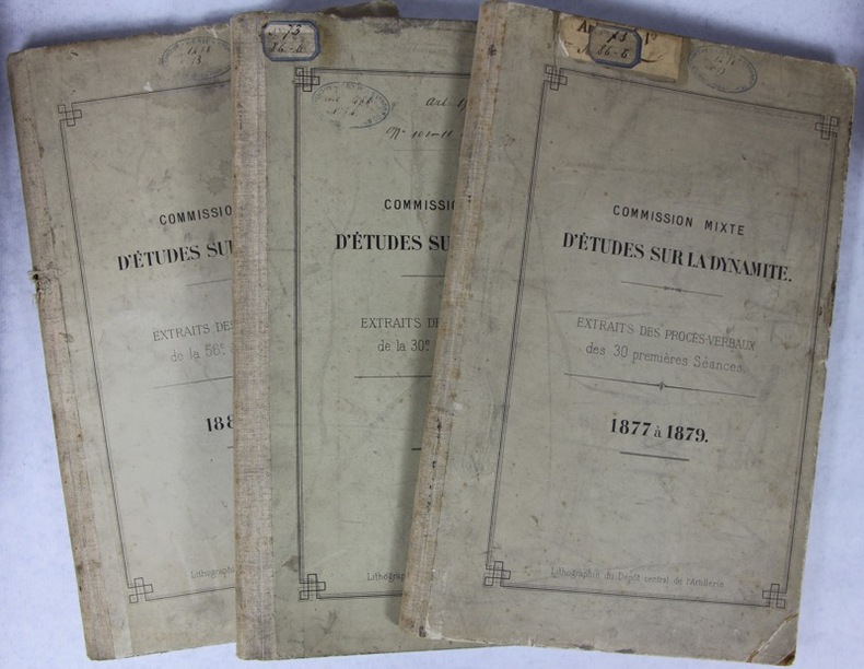 sl (Paris), sn (Ministère de la guerre), sd (1879-1882) 1882 3 volumes in-folio, cartonnage éditeur. Texte autographié avec lithographies du dépôt central de l'Artillerie, très nombreux dessins dans le texte. Tome 1 : 30 premières séances, 1877 à 1879, 50 pages et 77 planches en 38 ff. ; tome 2 : de la 30e à la 47e séance, 1879 , V pp.- 51 ff & 16 planches lithographiées ; tome 3 : de la 56e à la 90e séances, 1880 à 1882147 pages dont 8 planches incluses dans la pagination. Il doit manquer un volumes pour les séances 48 à 55 que l’on trouve parfois incluses dans le second volume. Cartonnage poussiéreux, intérieurs frais.