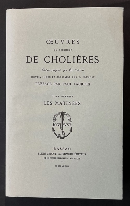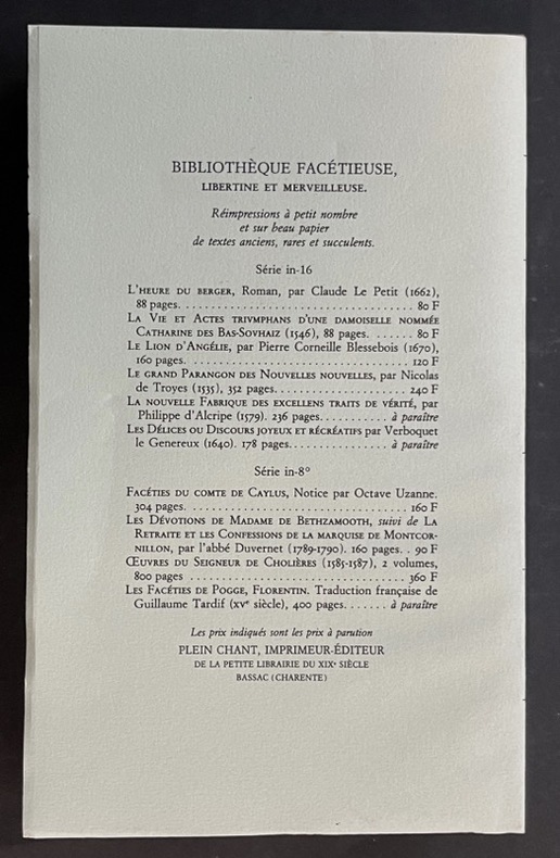 Bassac, Plein chant, coll. « Bibliothèque facétieuse, libertine et merveilleuse » 1994 In-8 broché 20,5 cm sur 12,5. XLIV-341 pages. Très bon état d’occasion.