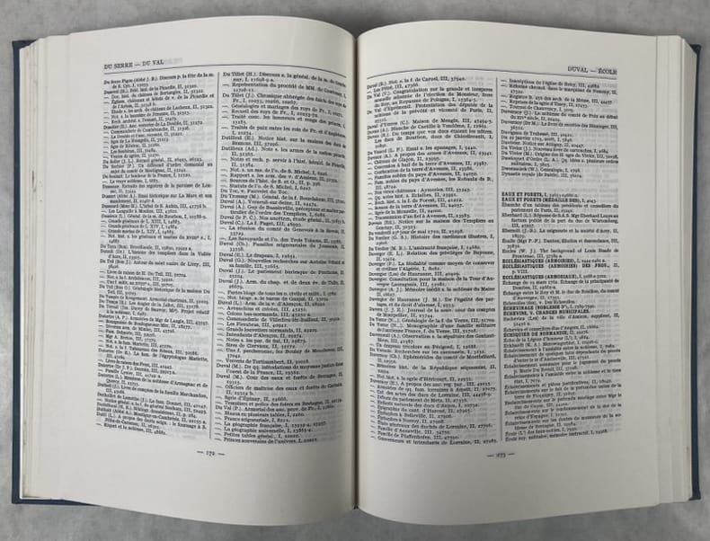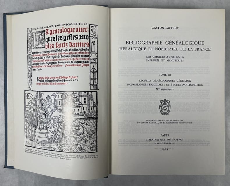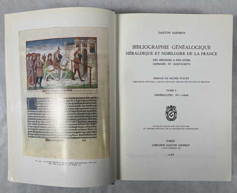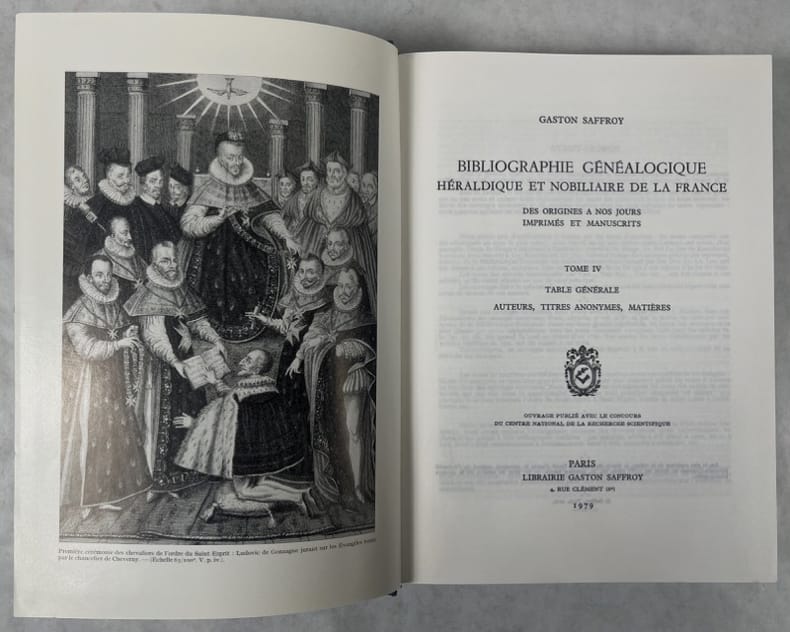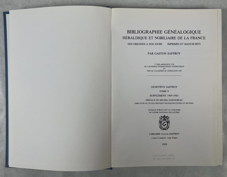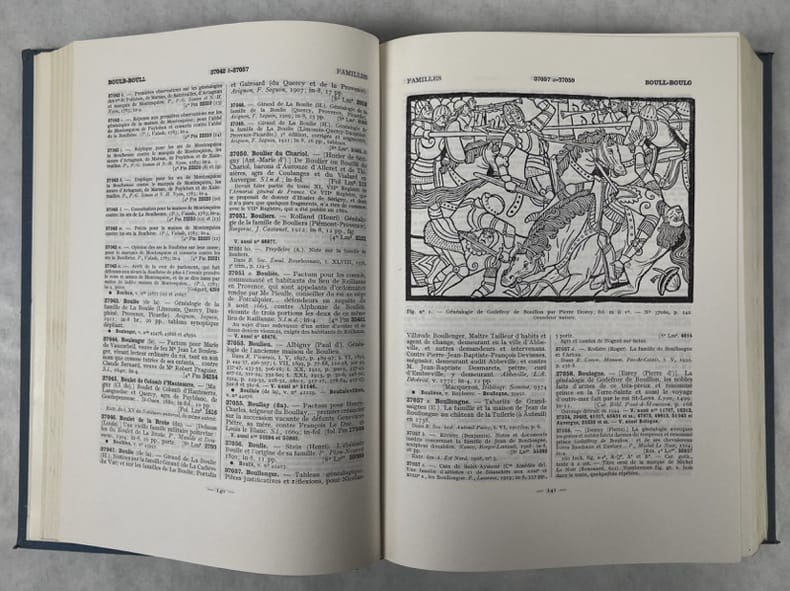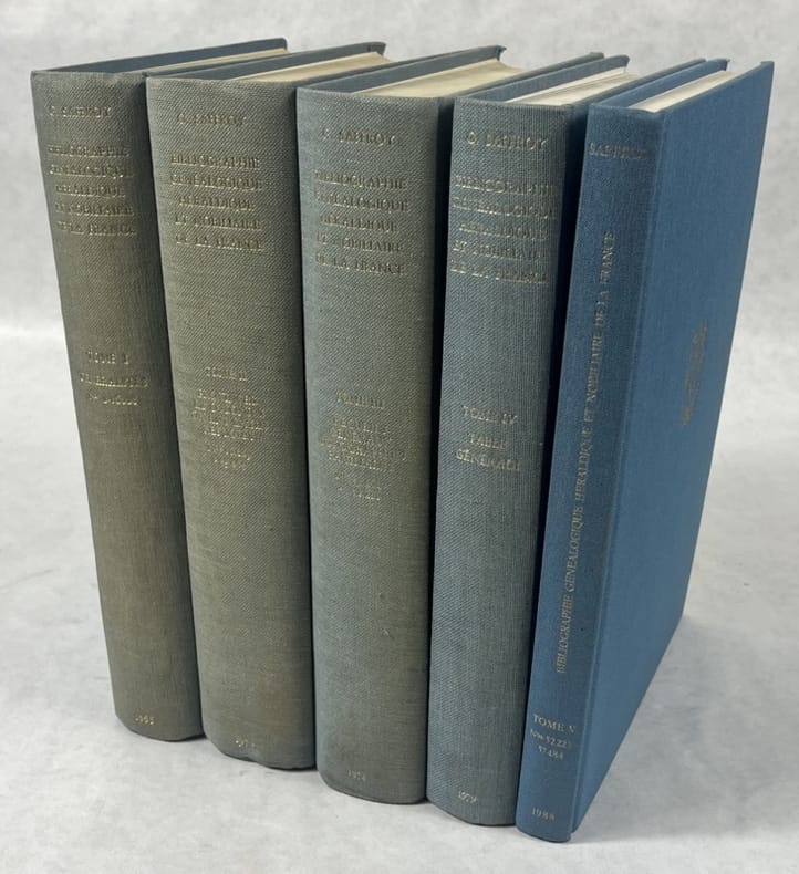 Comprend : 1. Généralités : Nos 1-16008 (1968) - 2. Provinces et colonies françaises, Orient latin, réfugiés. N°16009 - 33963 (1970) - 3. Recueils généalogiques généraux, monographies familiales et études particulières. N° 33964-52222 (1974) - 4. Table générale auteurs, titres anonymes, matières (1974) - 5. Supplément (1988) 1969-1983 Bon état d’occasion