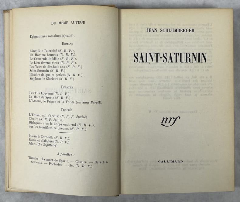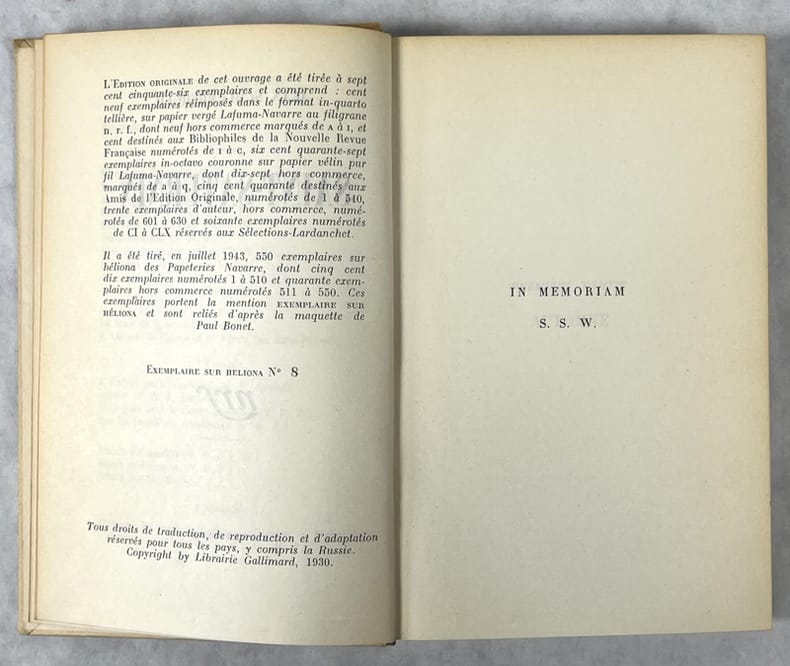 Paris, Nrf Gallimard 1944 In-12 18 x 11 cm. Cartonnage éditeur orné sur les plats et le dos de compositions en couleurs d’après la maquette de Mario Prassinos, 170 pp., table. Il a été tiré en février 1944, 550 exemplaires sur Héliona des papeteries Navarre dont 510 numérotés de 1 à 510. Celui-ci, N 91. Dos insolé, sinon exemplaire en très bon état. Bel exemplaire.