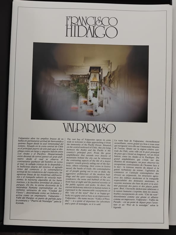Un volume petit in_8° (16, 5 x23, 5 cm), édition originale, broché, couverture à rabats, 64 pages dont 38 photos en noir de Sergio LARRAIN. Texte de Pablo NERUDA (4 pages) traduit par R. SOLIS. Ouvrage édité à l'occasion de l'exposition Sergio LARRAIN présentée dans le cadre des Rencontres internationales de la photographies d'Arles en 1991. Conception de l’ouvrage: Agnès Sire et Xavier Barral. Sur la 4ème de couverture Sergio LARRAIN écrit: “Valparaiso était le premier port rencontré par les navires ayant croisé le Cap Horn ou le Détroit de Magellan. C’était une sorte de station spatiale sur la planète Mars, qu’on atteignait après avoir lutté contre vents et marées, jamais certains d’atteindre la fin du voyage”... Et dans ses 4 pages de texte magnifiques, Pablo NERUDA écrit: “Petits mondes de Valparaiso, abandonnés sans raison hors du temps tels des caisses déposées un jour au fond d’un entrepôt que personne n’a jamais réclamées, dont on ignore la provenance et qui ne sortiront plus de leur enceinte”... La couverture éditeur est grise, en papier recyclé, avec le titre VALPARAISO en lettre rouges imprimées en diagonales. Minuscules marques d’usage sur cette couverture mais intérieur en état parfait. [50540].