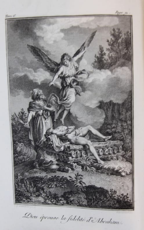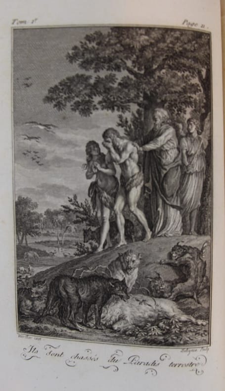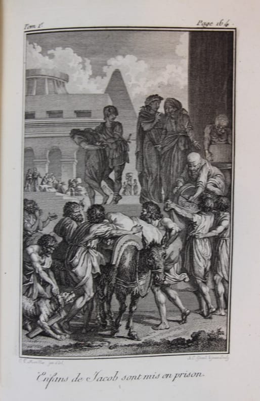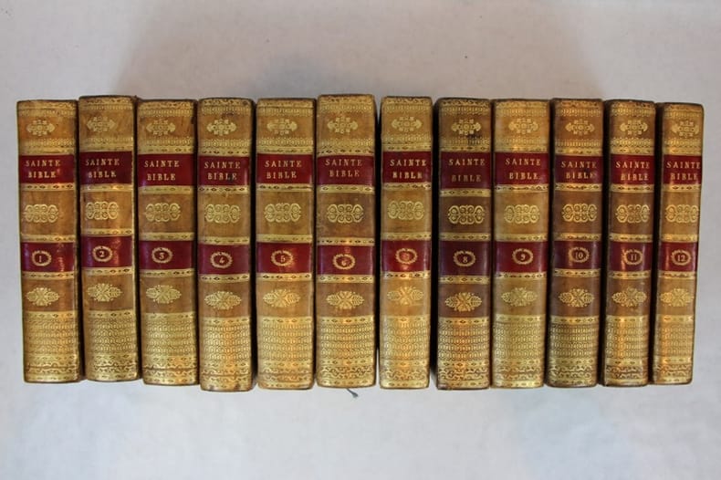 Paris, Defer de Maisonneuve [t. I-IV] ; Bastien, Ponce [tome V] ; Gay, Ponce, Belin [tomes VI-VIII, 1804 12 volumes in-8, basane fauve racinée, guirlandes, roulette dorée, dos richement orné, titre et tomaison de maroquin cerise Reliure de l'époque. Célèbre édition de la Bible, donnée par Louis-Isaac Lemaistre de Sacy, dans une version qui devint la référence officielle à la fin du XVIIIe siècle. Le dernier tome contient la table, une Chronologie sainte, un Dictionnaire de la géographie sacrée et la liste des souscripteurs. Monumentale par son illustration, elle est ornée de 300 figures hors texte gravées d'après Marillier et Monsiau par divers artistes et comprend une carte dépliante de la Terre Sainte gravée par Tardieu d'après Chanlaire. Interversions des pièces de tomaison des volumes 7, 8 et 9. Quelques restaurations aux plats. Très bon exemplaire frais & agréablement relié.