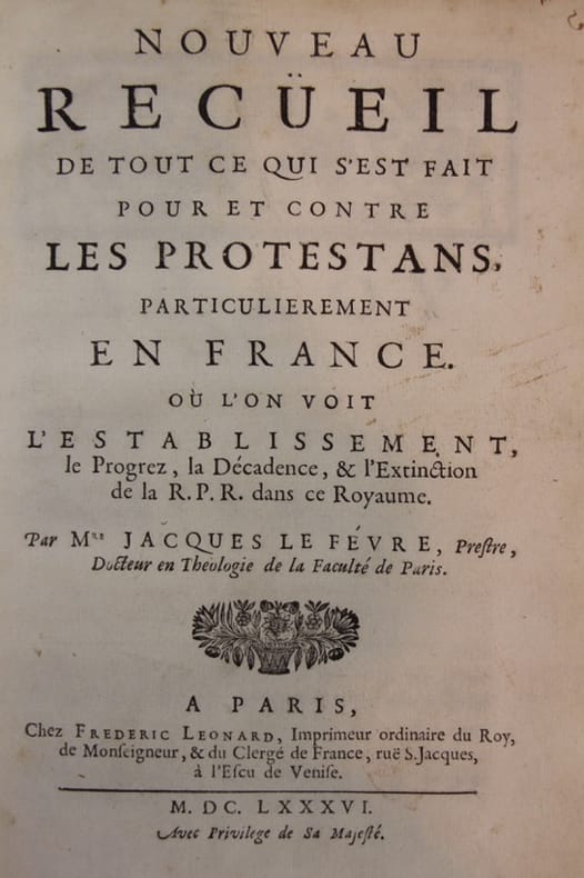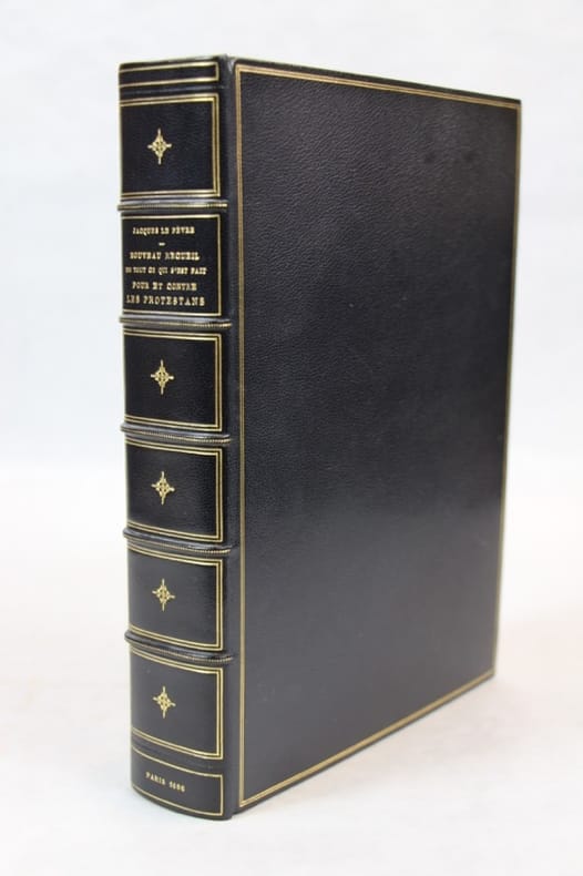 Paris, Frédéric Léonard 1686 4 parties en un volume in-4, maroquin bleu nuit, double filet doré dos orné, dentelle intérieure, tranches dorées Atelier Laurenchet, 6- 687-xlviii- icvi- 47 pp. Rousseurs éparses ; cassure sans manque au pied d'un feuillet. Edition originale de ce recueil important pour l’histoire du protestantisme en France. On trouve un intéressant Catalogue des livres condamnez et deffendus par le mandement de l'archevêque de Paris aux pp. 325-357 et, en fin de volume, trois annexes sous pagination particulière : 1 Liste des temples de la religion P. R. abbatus depuis le règne de Louis le Grand. 2 Recueil de ce qui s'est fait en France de plus considérable contre les protestans, depuis la révocation de l'Édit de Nantes. 3 Nouveau recueil... Quatrième partie contenant la révocation de l'Édit de Nantes, et les édits, déclarations et arrêts rendus depuis 47 pp.. L'ouvrage paraît complet. malgré sa pagination erratique. Jacques Le Fèvre, prêtre et théologien né à Coutances et mort en 1716, est l'auteur de plusieurs ouvrages de controverse religieuse. Il exerça les fonctions d'archidiacre de Lisieux, puis de vicaire général de l'évêque de Bourges. Bel xemplaire luxueusement relié.