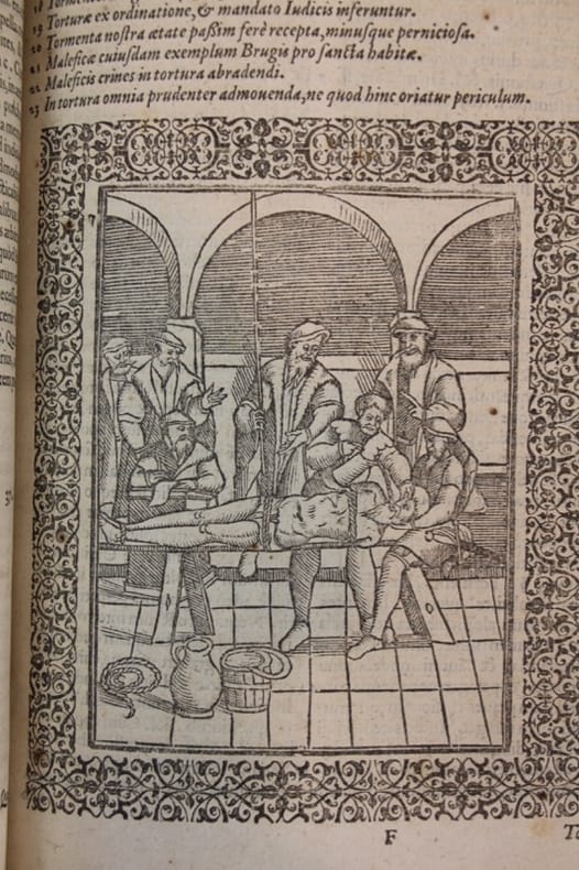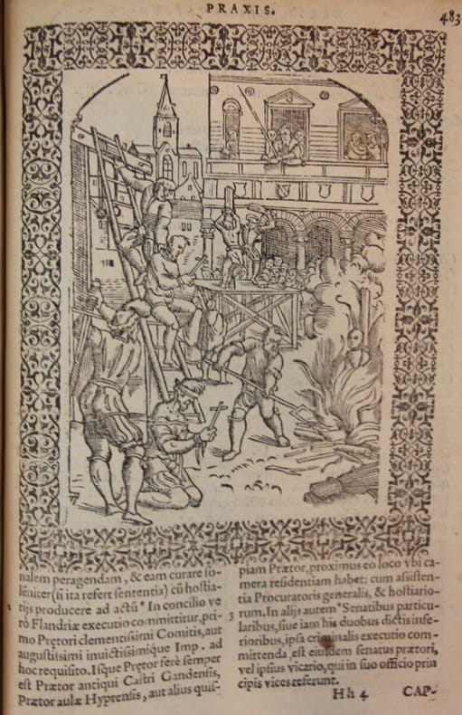 Anvers, Jean Bellère 1570 Petit in-4, basane marbrée, dos orné, tranches jaspées Reliure du XVII e siècle. Coiffe supérieure manquante, marge en pied du titre refaite, rousseurs et piqûres éparses, quelques feuillets brunis. Célèbre manuel de droit criminel, recherché pour son illustration, détaillant les crimes et châtiments judiciaires en vigueur en Flandre et ailleurs, compilé par le jurisconsulte brugeois Joost de Damhouder 1507-1581 et publié originellement en 1551. Cette nouvelle édition latine revue et augmentée est ornée de 73 bois gravés, dont un portrait et les armoiries de l'auteur, celles du dédicataire, Philippe de Noircarmes, et 70 figures dans le texte, souvent à pleine page, représentant des scènes de crime et de débauche, ainsi que les supplices auxquels étaient soumis leurs auteurs.