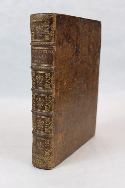 Paris, Charles-Antoine Jombert 1752 In-4, veau marbré, dos orné, tranches rouges Reliure de l'époque, xliv, 484 pages. Bon exemplaire bien relié à l'époque. Petit travail de ver marginal dans le dernier quart du volume ; pl. XXI un peu froissée et effrangée. Edition originale. L'illustration gravée en taille-douce comprend un frontispice par Chedel d'après Ozanne, un fleuron sur le titre et une vignette en tête de la dédicace par le second, 10 ravissantes vignettes en tête des chapitres par Chedel 1 et Ozanne 9, qui représentent des ingénieurs maritimes devant des maquettes et des scènes de chantiers navals, de stéréotomie du bois, des arsenaux et des vues avec des voiliers, et enfin 23 planches dépliantes non signées, dont une à 2 sujets pl. VIII et IX.