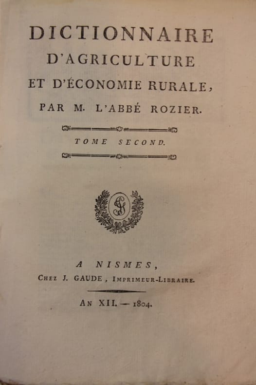 Paris, rue et hôtel Serpente [Cuchet] (t. I-IX), Delalain fils (t. X) 1801 10 volumes in-4, demi-basane marbrée, dos à nerfs, armoiries dorées en queue, tranches rouges Reliure de l'époque. Texte sur deux colonnes, frontispice & 240 planches hors-texte, 17 dépliantes, tableaux hors-texte. Quelques rousseurs, frottements et petits défauts d'usage. On joint deux volumes, du même : Cours complet d'agriculture... Tome XIe [sans le XIIe] Paris, Marchant, 1805. In-4, broché, couverture muette d’attente - Dictionnaire d'agriculture et d'économie rurale. Tome second [sans le I er] Nîmes, Gaude, 1804. In-4, broché, couverture d’attente. Humidité marginale en tête Edition originale, illustrée de nombreuses planches gravées sur cuivre par Sellier, Tardieu et Moisy, d'une carte, de tableaux dépliants et d'un portrait de l'auteur par Hulk. Exemplaire aux armes d'un contemporain, frappées au dos des huit volumes parus avant la Révolution. Le dixième tome a été publié après la mort de l'abbé Rozier ; rédigé par Chaptal, Parmentier, Biot, Thouin, Lasteyrie, etc., il est presque entièrement consacré à la vigne et au vin. Ce volume est en second tirage et sa reliure n'est pas homogène.