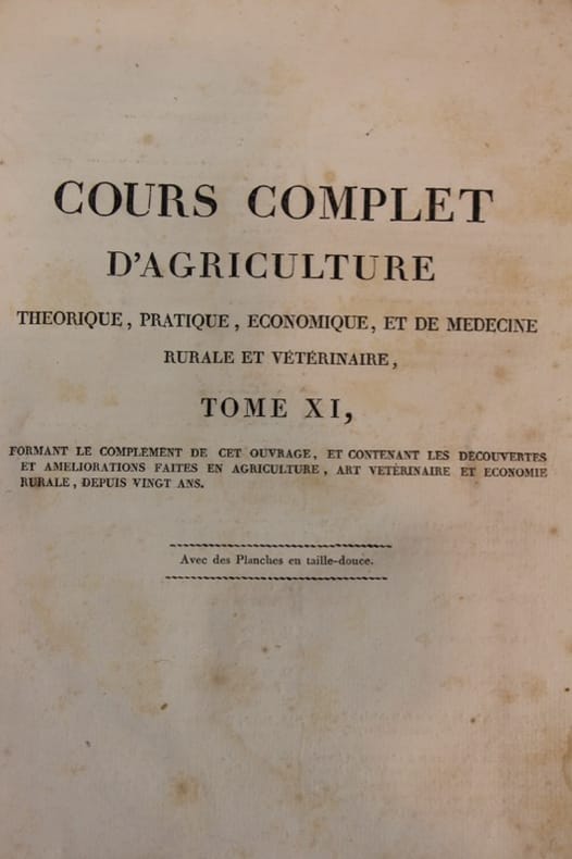 Complet des 9 premiers volumes rédigés par l'abbé Rozier. Cet ouvrage fut continué par un 10e volume publié par Chaptal, Dussieux, Lasteyrie etc., et 2 volumes de supplément ont parus en 1805 chez le libraire Marchand.