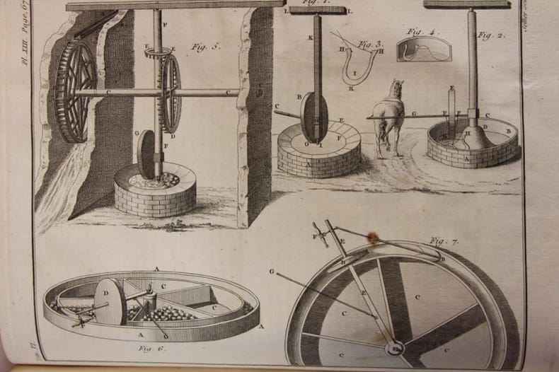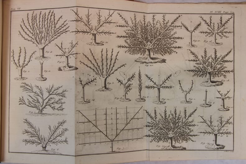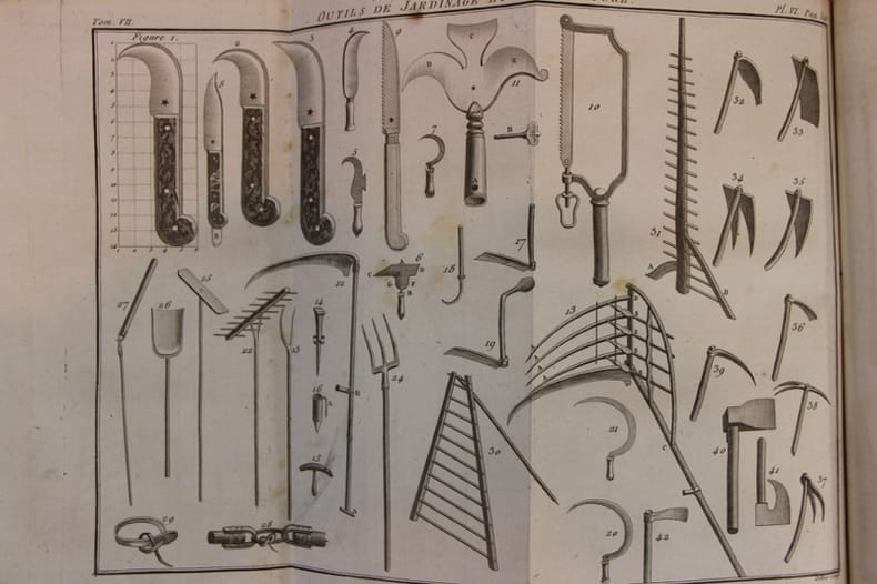 Va de Chanvre à Diamètre. 3 planches sur les charrues, 1 planche sur les châssis (dépliante), une pour le chien, 2 pour le cheval, 1 pour le cochon, une pour la cuve (dépliante), pour les dents et 10 de botanique.