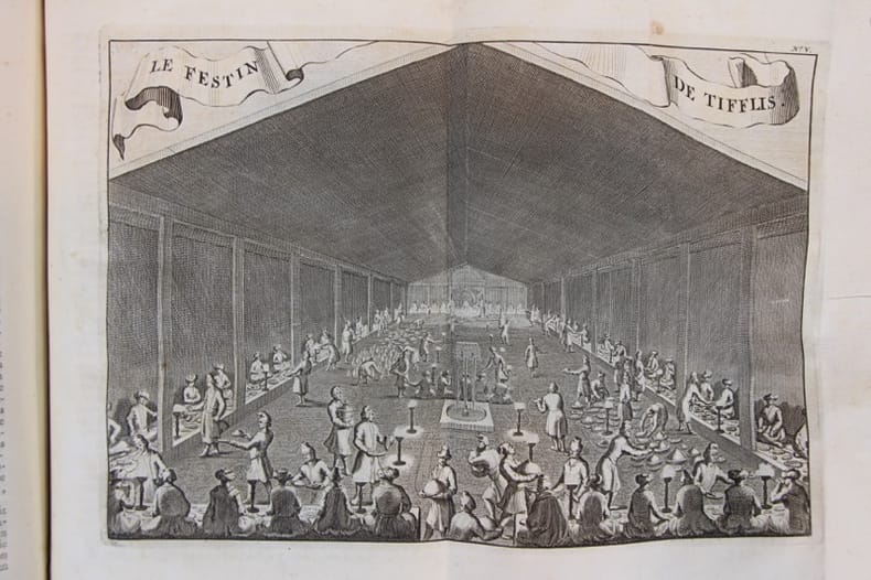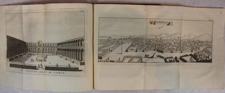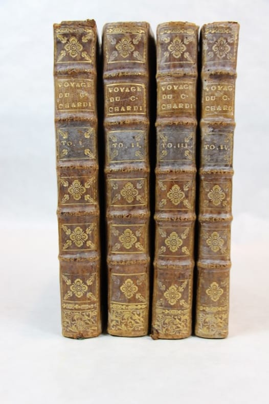 Amsterdam, aux dépens de la Compagnie, 1735 4 volumes in-4, veau marbré, dos à nerfs, caissons ornés, tranches mouchetées Reliure de l'époque, 7 ff.n.ch. faux-titre & titre, avertissement des libraires, préface, placement des gravures- 390 pp.- ff.n.ch.- 359 pp.- 2 ff.n.ch.- 437 pp.- 3 ff.n.ch.- 324 pp.- 15 ff.n.ch. 80 planches gravées dont le frontispice répété, la plupart replées et de grande dimension. Épidermures sur les plats, coins usés, petits accrocs à certaines coiffes. Un planchze double déliée. Intérieur très frais. La plus belle et la plus complète édition des Voyages de Chardin l'originale de 1686 consistant en un seul volume in-folio. tant pour le texte la première s'arrête en 1673 que pour les gravures. Joaillier protestant exerçant, comme son père, Place Dauphine, Jean Chardin 1643-1713 effectua, pour des raisons commerciales, plusieurs voyages en Perse, région alors très peu connue des Occidentaux 1665, 1671-1680, avec des incursions en Turquie, dans le Caucase et en Inde. Fuyant la France en 1681, avant même la promulgation de l'Edit de Fontainebleau, il se réfugia à Londres, où Charles II le nomma bijoutier de la Cour. De la bibliothèque du baron Camille de Warenghien de Flory 1890-1965, avec ex-libris.