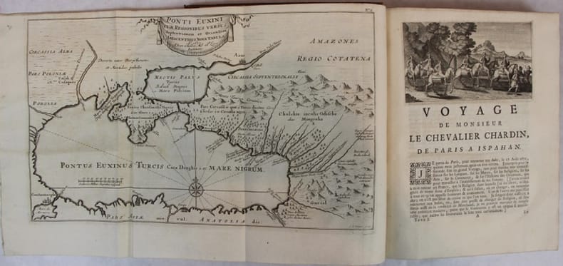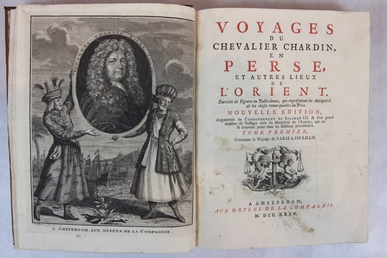 Première édition complète des voyages de Chardin en Perse, augmentée de plusieurs passages et du couronnement de Soliman III. Brunet, I, 1802 ; Chadenat, I, 1566 ; Schwab, Bibliographie de la Perse, n°87-88 ; Wilson p.40 ; Atabey 220 ; Diba p. 238. Le Couronnement de Soliman III confère un intérêt particulier à la présente édition. « Cette relation, dit Boucher de la Richarderie, n’a point été insérée dans les éditions des voyages de Chardin en 1711 et 1723. Elle ne se trouve que dans la dernière édition de ses Voyages, donnée après sa mort en 1735.- Très rare ». (Bibliographie de la Perse). « Le témoignage unanime des voyageurs qui, depuis Chardin, ont visité et décrit les mêmes contrées, n’a servi qu’à constater la justesse, la profondeur de ses observations, la variété de ses connaissances et sa véracité […] La première édition de ses voyages, publiée à Londres en 1686 in-folio, ne contient que le voyage de Paris à Ispahan ; elle n’a pas été continuée parce que l’auteur partit pour la Hollande où il publia 2 autres éditions, à peu près complètes de son Voyage en Perse. Nous disons à peu près complètes car le libraire Delorme exigea de l’auteur la suppression de certains passages capables de déplaire au clergé romain, et d’empêcher le débit de l’ouvrage en France. Ces passages ont été réintégrés dans l’édition de 1735, 4 volumes in-4 ». (Biographie universelle, VII, 506). Cette édition est ornée de 79 gravures hors texte dont 51 dépliantes, de 2 frontispices et de 4 vignettes en tête. Le tome 2 présente des tableaux dépliants atteignant jusqu’à 190 cm de longueur et représentant les bas-reliefs d’un temple des ruines de Persépolis. Chadenat mentionne à propos de cette édition « 79 belles planches repliées : cartes, vues, scènes, etc. ». Il précise qu’il possède « une très belle édition, dans une jolie reliure [en veau jaspé avec un compartiment de veau clair sur les plats], de cet ouvrage estimé ». Fils d’un joaillier de la place Dauphine à Paris, Chardin partit en 1665 pour les Indes dans le but accessoire d’y faire le commerce des diamants, et surtout entraîné par la passion des voyages. Il traversa la Perse, visita Surate, Ormus, et revint se fixer à Ispahan, où il séjourna 6 années et où le Schah Abbas II le nomma son « marchand ». « Sa position officielle, ses relations avec les principaux personnages, la connaissance qu’il s’empressa d’acquérir des idiomes du pays, lui permirent de recueillir une multitude de renseignements sur le gouvernement, les mœurs, les antiquités, les monuments et l’histoire de la Perse. Un dessinateur habile, qu’il avait amené, l’accompagnait dans toutes ses explorations, et il put rapporter ainsi des reproductions exactes des monuments, des costumes, des ruines de Persépolis, des armes, des ustensiles, … On a prétendu que l’académicien Charpentier avait aidé Chardin dans la rédaction de son livre. Quoiqu’il en soit, ce qui appartient incontestablement à l’illustre voyageur, ce sont ces matériaux précieux recueillis avec tant d’intelligence et de courage, ces recherches profondes, ces observations, ces renseignements curieux et authentiques sur l’histoire, l’administration, la législation, les mœurs, les sciences, les arts, les usages d’un pays pour ainsi dire inconnu jusqu’alors. Le témoignage unanime des voyageurs, dit Langlès, qui, depuis Chardin, ont visité et décrit les mêmes contrées, n’a servi qu’à constater la justesse, la profondeur de ses observations, la variété de ses connaissances et sa véracité ». « Ce voyage est un des plus intéressants que l’on ait publiés dans le siècle dernier. Cette edition est encore assez recherchee […] et elle se trouve difficilement » mentionne Brunet. Bel exemplaire, à belles marges, orné de 79 superbes gravures à pleine page, conservé dans son élégante reliure de l’époque en veau mosaïque.