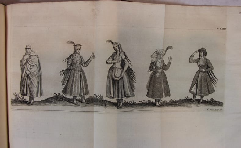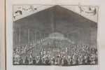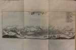 Cette édition est ornée de 79 gravures hors texte dont 51 dépliantes, de 2 frontispices et de 4 vignettes en tête. Amsterdam, aux dépens de la Compagnie, 1735. 4 tomes en 2 volumes in-4 de : I/ (7) ff., 390 pp., (1) f. bl., (2) ff., 359 pp, 1 frontispice, 61 planches, 2 cartes et 2 vignettes dans le texte ; II/ (3) ff., 437 pp., (3) ff., 324 pp., (15) ff., 1 frontispice, 16 planches et 2 vignettes dans le texte. Veau fauve mosaïqué, plats entièrement ornés d’un double encadrement mosaïqué alternant veau brun et veau fauve avec panneau central plus foncé, le tout souligné de roulettes et fleurons estampés à froid, filet doré d’encadrement, dos à nerfs richement ornés, tranches mouchetées. Reliure anglaise de l’époque. Marques d’appartenance de deux bibliothèques sur les feuillets de titre. 247 x 195 mm.