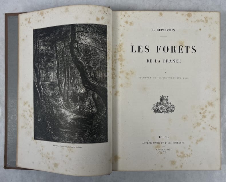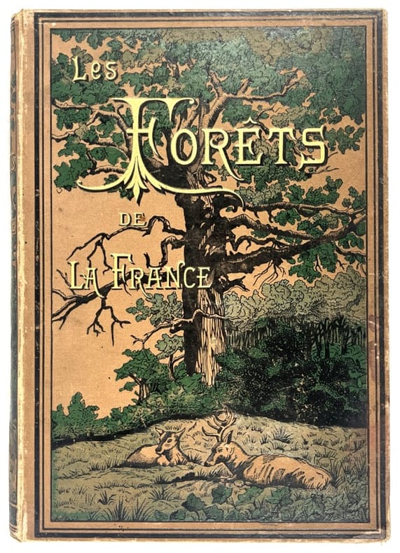 Tours, Alfred Mame et fils 1886 In-4 30 x 20,5 cm. Cartonnage éditeur percaline chataîgne, au premier plat, noir, vert et or, un chêne dans une clairière, biche et cerf assis à son pied, au second plat, encadrement de motifs géométriques, au dos arbre en long dans le style du plat, tranches dorées, 400 pp., 100 gravures sur bois par Karl Bodmer, Gustave Courbet, Yan Dargent, Karl Girardet, Riou, etc., table. édition originale. L' ouvrage aura une deuxième édition en 1887. Mors et coins légèrement frottés, rousseurs éparses, gouttère régulière.