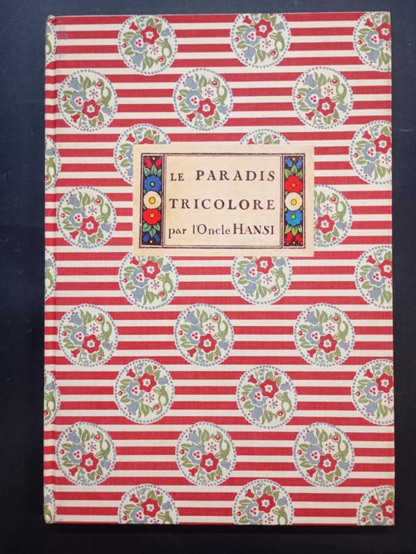 H. Floury, Editeur, 1, Bd des Capucines, Paris, 1918. In-4 reliure pleine toile à bandes rouges et blanches, ornée de motifs floraux, de 40 pages au format 21 x 31 cm. Premier plat avec vignette de titre contrecollée. Dos carré sans titre. Pages de garde illustrées. Tête et tranches rouges. Toile un peu brunie en haut et bas des plats. Intérieur frais, malgré un peu de " jeu " à certains cahiers et d'infimes pliures aux coins intérieurs de quelques pages. Tirage sur couché. Textes et magnifiques illustrations en couleurs par Jean-Jacques Waltz dit Hansi. Très bel état général. Rare édition originale.