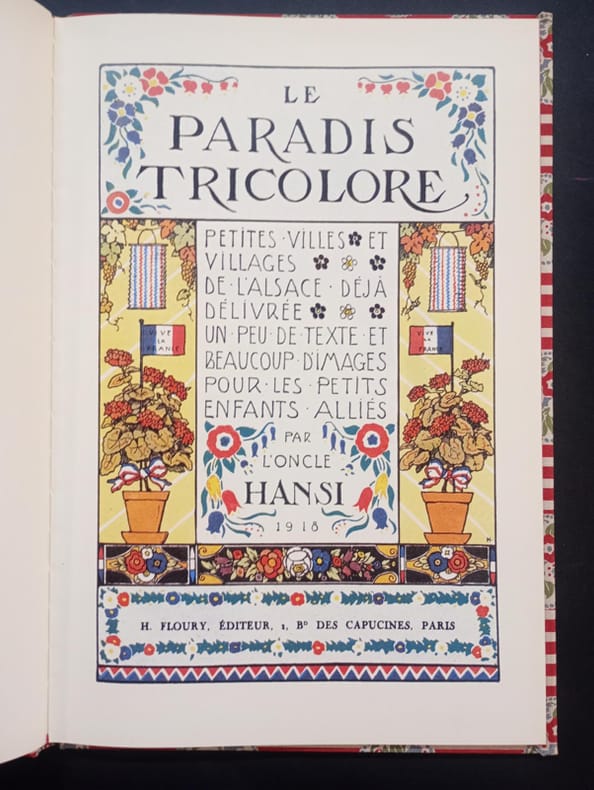 Paris, H. Floury éditeur, 1918, 1 vol. in-4° (30,8 x 21,3 cm) : 1 db-garde illustrée, 1 f. de faux-titre, 1 f. de titre, 1 f. de 'préfasse' (dixit), 16 f. de texte, 1 f. de table des hors-textes, 1 db-garde illustrée ; sous-titré : Petites villes et villages de l'Alsace déjà délivrée - un peu de texte et beaucoup d'images pour les petits enfants alliés par l'Oncle Hansi. Edition originale de cet album pour enfants, fortement emprunt du contexte historique de la première guerre mondiale : les images idéalisent les villages alsaciens et leurs traditions tandis que les textes sont sans concession vis à vis des allemands. Le sentiment français, alsacien en particulier, exhalté par l'auteur n'a d'égal que la beauté des images in et hors-texte qui le portent. La narration rend compte de la vie quotidienne et de la difficulté de vivre en temps de guerre et d'annexion. Jean-Jacques Waltz, dit Oncle Hansi, Hansi (1873-1951) : peintre, graveur, illustrateur et narrateur d'albums pour enfants pronant le retour de l'Alsace-Lorraine à la France dans le cadre de l'annexion allemande entre 1870 et 1918. Louis Weizenacker : préfacier en culottes courtes.
