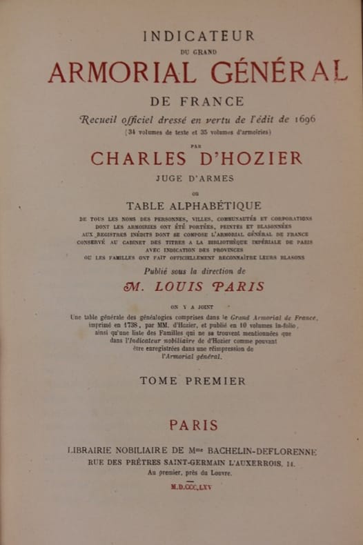 Ouvrage indispensable pour pouvoir faire une recherche rapide dans les 69 volumes de l'armorial d'Hozier.