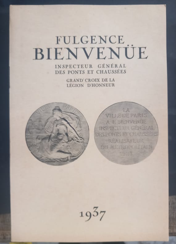 Paris, Perceval, 1937. Grand in-8 broché (25 x 16 cm) 237 pages, illustré de nombreuses photographies hors-texte dont un portrait en frontispice, les différentes personnalités de l'époque, des vues des stations de métro inaugurées etc. Grande carte dépliante en couleurs des lignes du métro Parisien. Dans cet ouvrage, différents hommages sont rendus à Fulgence Bienvenüe, suivis d'un "Commentaire technique sur le Métropolitain de Paris", fait par l'auteur. Très bon état.