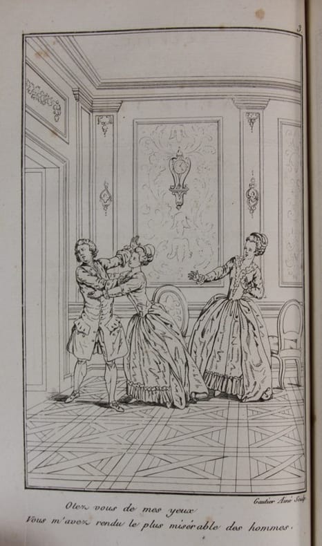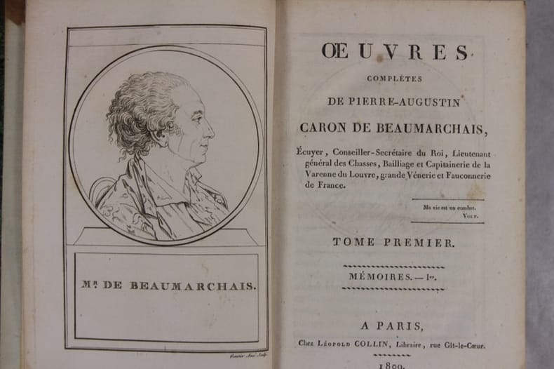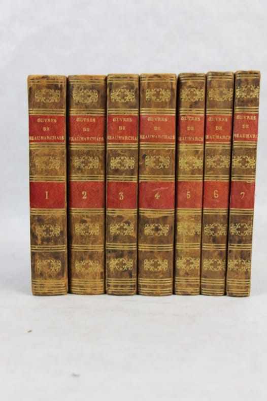 P., Léopold Collin 1809 7 volumes in-8, demi-veau, dos lisse, pièces de titre et tomaison de maroquin cerise, filets et fleurons dorés reliure de l’époque. Portait frontispice & 25 gravures hors-texte. Menus frottements, quelques coins émoussés, rares rousseurs. Bon exemplaire. Première édition collective des oeuvres de Beaumarchais, publiées sous la direction de Gudin, son secrétaire, et illustrées de gravures témoignant des premières mises en scène du Barbier de Séville, du Mariage de Figaro, d'Eugénie, de la Mère coupable, etc. Contient : I-II Theâtre, III-IV Mémoires, V Epoques, VI-VII Correspondance. Brunet I, 720 - Cohen p.127 "très bien gravé par Gautier" - Quérard Fr. litt. I, 240. "Les figures du Mariage de Figaro sont des copies de celles de Saint-Quentin de l'édition de 1785, et celles d'Eugénie sont faites d'après celles de Gravelot, pour l'édition de 1767."