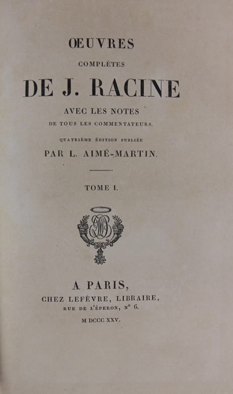 Edition originale de la version "variorum" de Louis Aimé-Martin. Elle a été abondamment truffée à l'époque de 47 planches supplémentaires qui n'appartiennent pas à cette édition (laquelle ne comprend que 19 planches, y compris le portrait-frontispice) : nous signalons dans la collation le nombre de planches de chaque volume avec, entre crochets, le nombre de figures des exemplaires non truffés, et leur description.I. [2] ff. n. ch., cc pp., un f. n. ch., 269 pp., un f. n. ch. de table, avec 9 planches gravées, dont 3 portraits-frontispices [3, dont un frontispice gravé par Taurel, et les figures de l'Etourdi et du Dépit amoureux d'après Desenne]. - II. [2] ff. n. ch., 412 pp., un f. n. ch. de table, avec 12 planches gravées [3 figures d'après Desenne pour Les Précieuses ridicules, Sganarelle et L'Ecole des maris]. - III. [2] ff. n. ch., 500 pp., avec 8 planches hors texte [une seule, pour illustrer l'Ecole des femmes]. - IV. [2] ff. n. ch., 457 pp., un f. n. ch. de table, avec 7 planches hors texte [2, pour Don Juan et Le Misanthrope]. - V. [2] ff. n. ch., 548 pp., avec 10 planches hors texte [3, pour Le Médecin malgré lui, Le Tartuffe et Amphitryon]. - VI. [2] ff. n. ch., 429 pp., [3] pp. n. ch., avec 8 planches hors texte [3, pour L'Avare, George Dandin et Monsieur de Pourceaugnac]. - VII. [2] ff. n. ch., 382 pp., [3] ff. n. ch., avec 4 planches [une seule, pour Le Bourgeois gentilhomme]. - VIII. [2] ff. n. ch., 572 pp., avec 8 planches [3, pour Les Fourberies de Scapin, Les Femmes savantes et Le Malade imaginaire]. Vicaire II, 526-527. Cioranescu, XVII, 47814.Bel exemplaire. - - VENTE PAR CORRESPONDANCE UNIQUEMENT