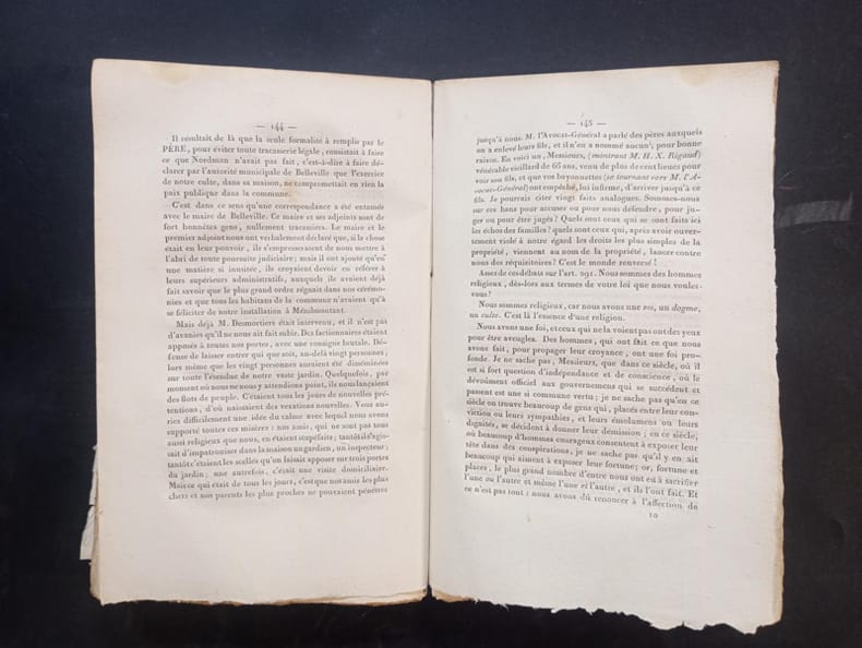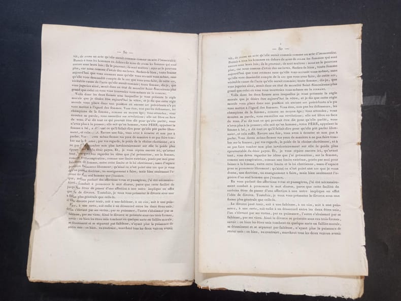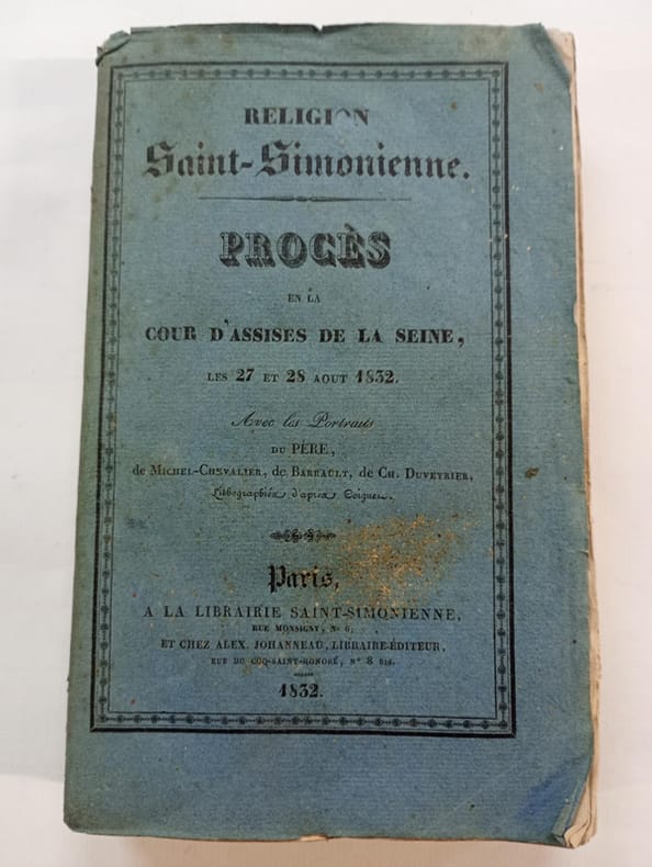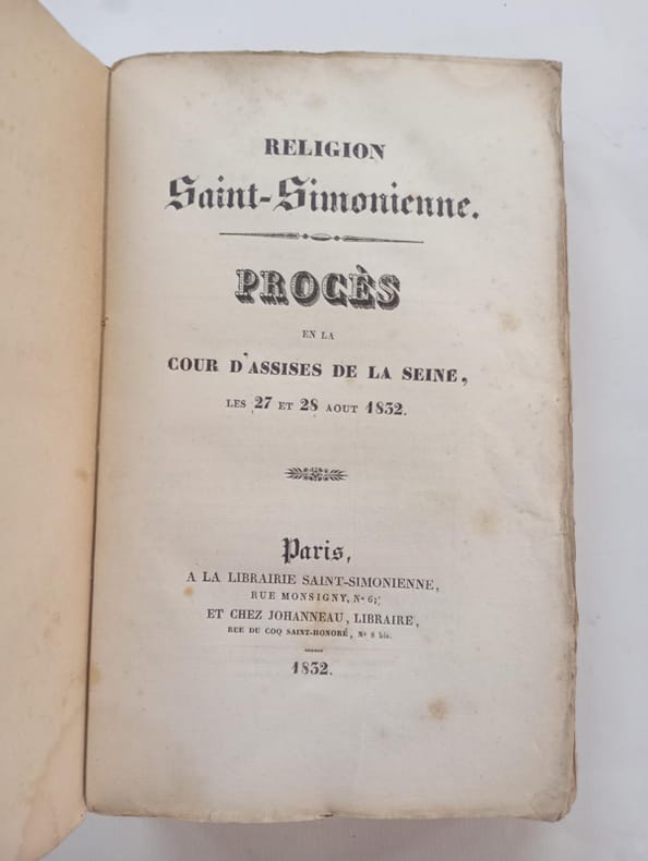 Paru le 19 octobre 1832 et tiré à 1000 exemplaires, ce volume donne le compte-rendu rédigé à la sauce saint-simonienne du premier procès de l'association, qui eut lieu devant la Cour d'assises de la Seine pour des motifs en réalité assez nébuleux, et qui dissimulaient mal une volonté politique de normalisation, en ce moment encore très instable pour la jeune Monarchie de Juillet.Fournel, p. 110. Rosanvallon, 133. - - VENTE PAR CORRESPONDANCE UNIQUEMENT