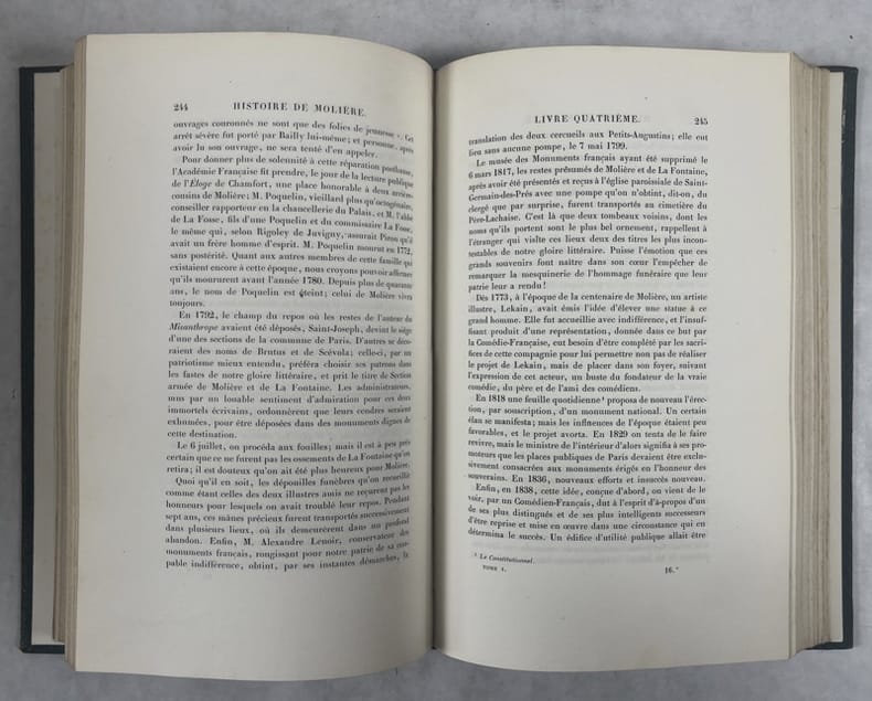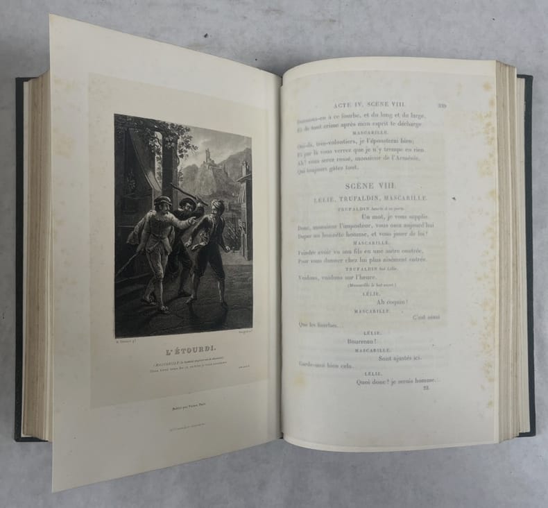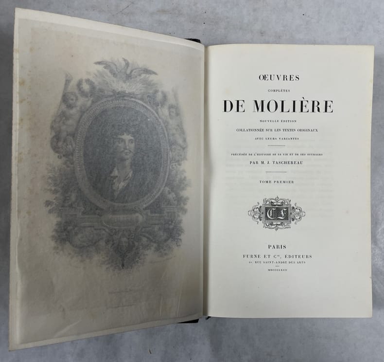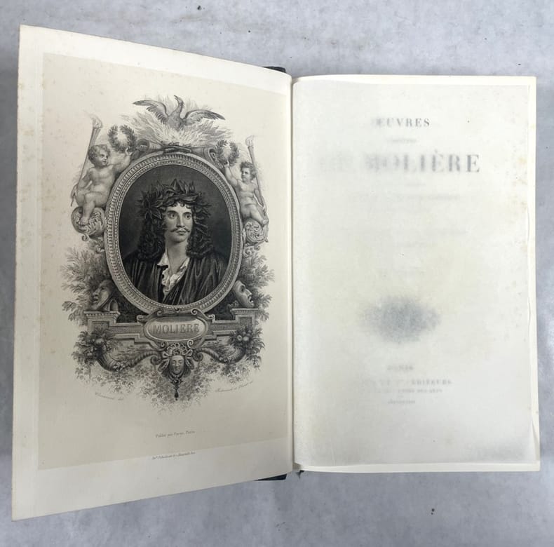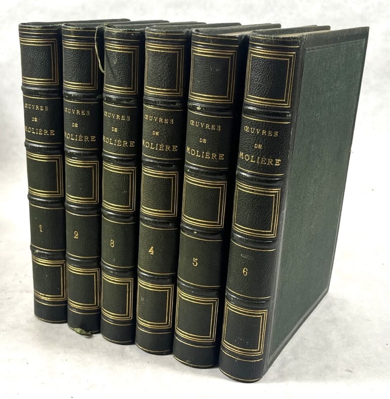 Paris, Furne 1863 6 volumes. In-8 23 x 14,5 cm. Reliures éditeur demi-chagrin vert-émeraude, dos à nerfs, caissons orné d’un triple cadre doré, XVI-557-446-429-459-524-475 pp., portait de Molère en frontispice, 3-3-3-3-3-3 gravures hors-texte sous serpentes, tables. Bel ensemble bien relié.