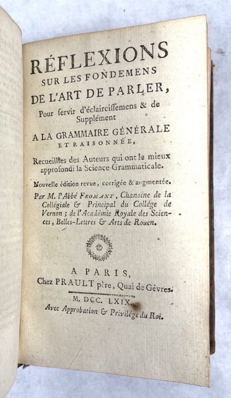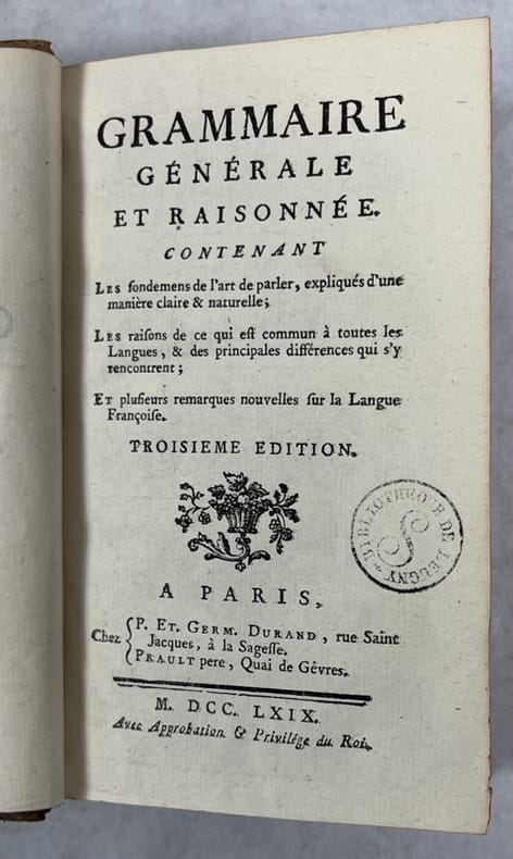 Publiée en 1760 sous le titre original “Grammaire générale et raisonnée contenant les fondemens de l'art de parler, expliqués d'une manière claire et naturelle”, parfois aussi désignée sous les expressions, “Grammaire générale et raisonnée de Port-Royal” ou “Grammaire générale de Port-Royal” est un ouvrage de grammaire de la langue française d'Antoine Arnauld (1612-1692) et Claude Lancelot (1615-1695). Bon état d’occasion