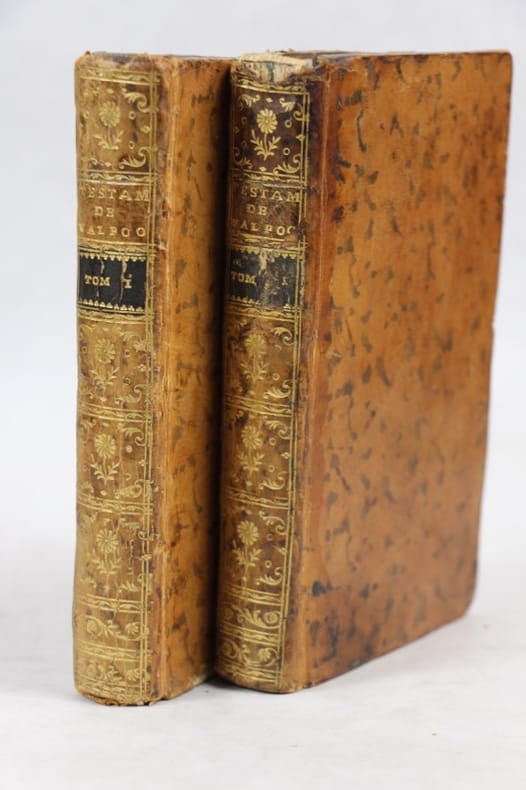 Amsterdam, Arkstée & Merkus, 1767. 2 volumes in-12, plein veau marbré époque, dos à nerfs orné de filets et de fleurons dorés, titre doré, coupes filetées, toutes tranches rouges. Faux-titre, titre, VIII, 168 pp, 254 pp; faux-titre, titre, 408 pp. Coins, coiffes et coupes un peu frottés, coiffe inférieure du tome II manquante, petits frottements sur les plats, quelques rousseurs, quelques feuillets roussis.