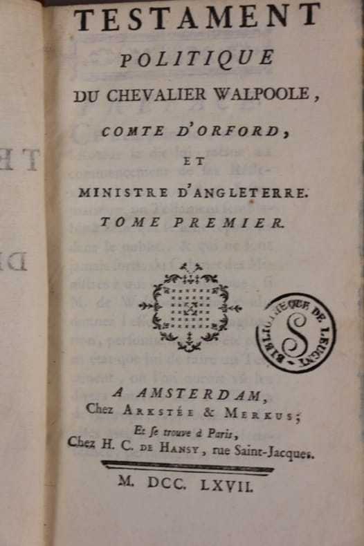 A Amsterdam, Et se trouve à Paris Chez Arkstée & Merkus - Chez H. C. de Hansy 1767 in 12 (17x10,5) 2 volumes reliures pleine basane fauve marbrée, dos à nerfs ornés de caissons dorés, pièces de titre de maroquin rouge, tranches teintées rouge. Tome 1: VIII, 168 et 254 pages [1]. Tome 2: 408 pages [1]. Robert Walpole, 1676-1745. J.-Henri Maubert de Gouvest, 1721-1767, publiciste et historien Français. Bel exemplaire ( Photographies sur demande / We can send pictures of this book on simple request )