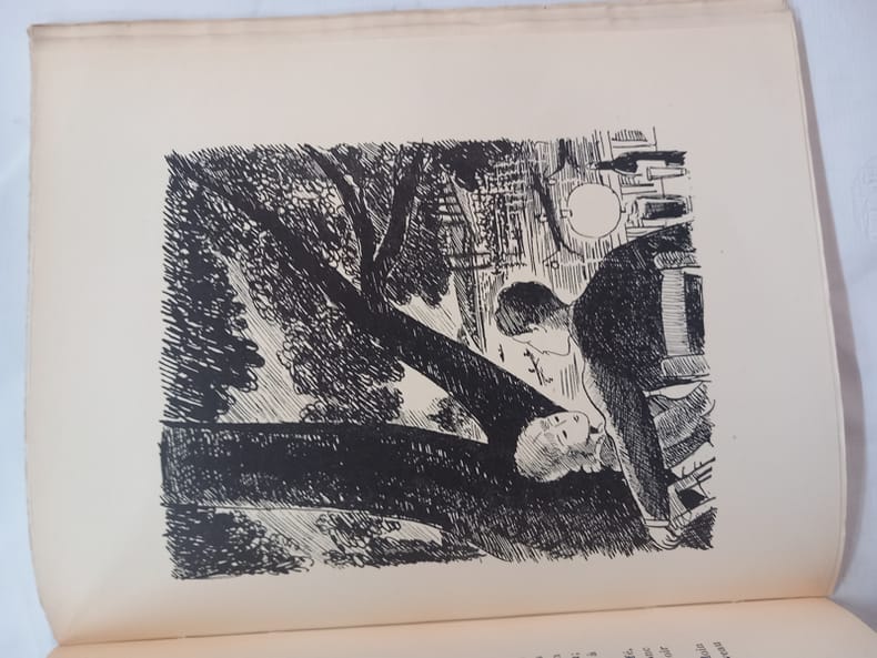 1 volume grand in-8° relié demi-basane bleue, dos à nerfs, titre doré, 389 p. + 8 hors-texte en couleurs et cinq cinq dessins en noir et blanc. Très bon état.