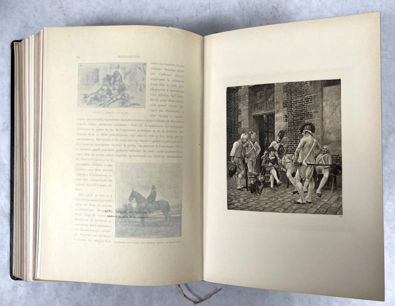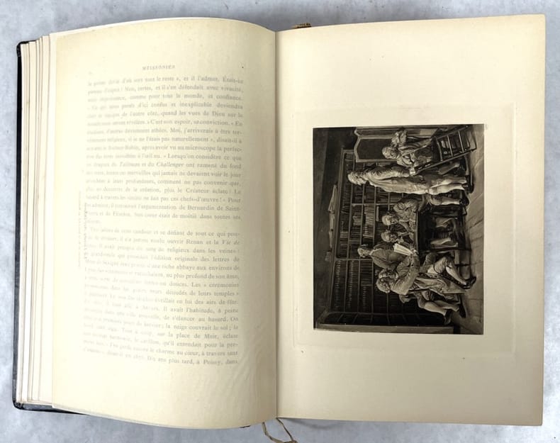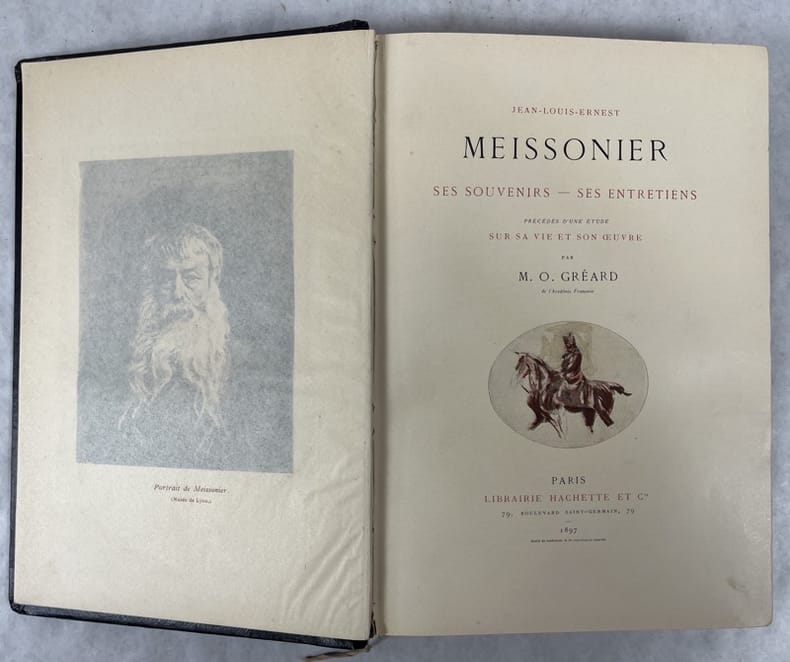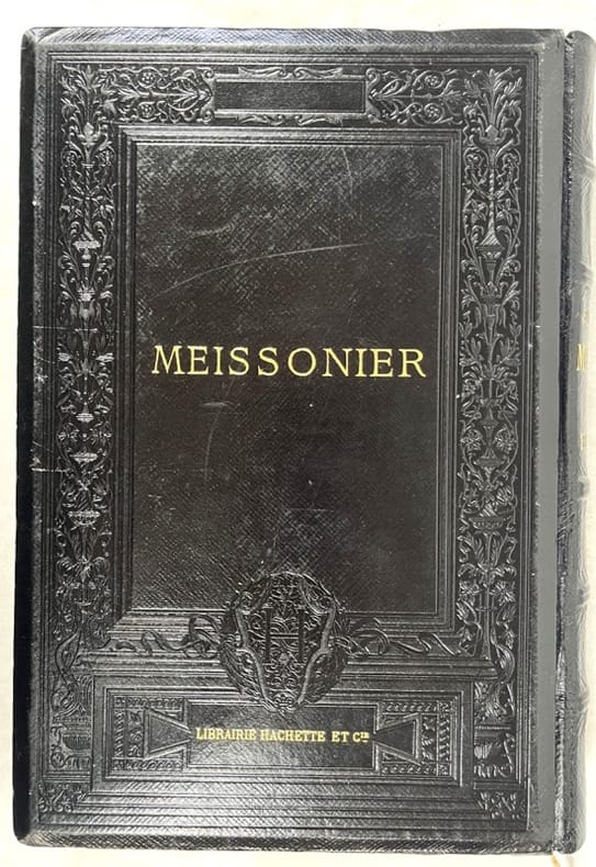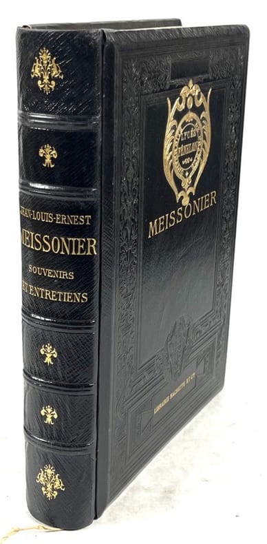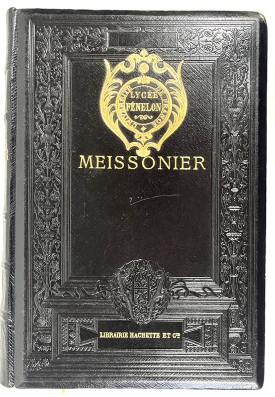 Paris, Librairie Hachette et Cie 1897 In-4 30 x 20 cm. Reliure éditeur demi-basane noire, dos à faux-nerfs encadrés de petits fers dorés, plats biseautésencadrés d’une frisegaufrée, fer du Lycée Fénelon, tranches dorées, 461 pp., 34 planches hors-texte sous serpentes et 236 illustrations dans le texte, table des gravures, table des matières. Bon exemplaire d’un ouvrage restant incontournable sur Meissonier et son oeuvre.