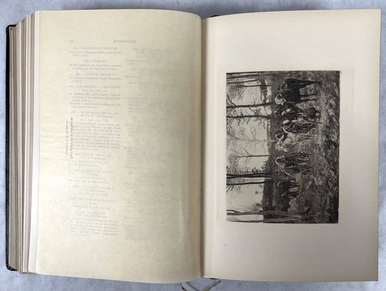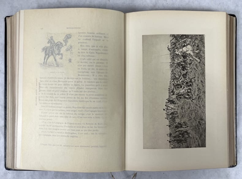 Paris, Librairie Hachette et Cie 1897 Fort in-4 30 x 20 cm. Reliure demi-basane rouge à coins, 461 pp., dos à nerfs, tête dorée, 461 pp., 34 planches hors-texte sous serpentes et 236 illustrations dans le texte, table des gravures, table des matières. Intérieur en très bon état, coins émoussés et frottés. Bon exemplaire d’un ouvrage restant incontournable sur Meissonier et son oeuvre.