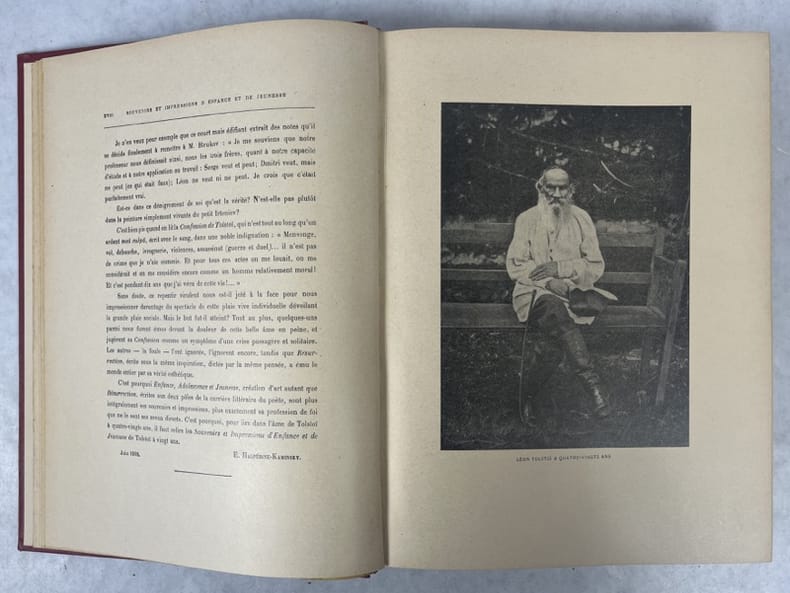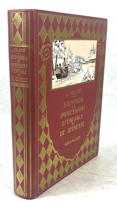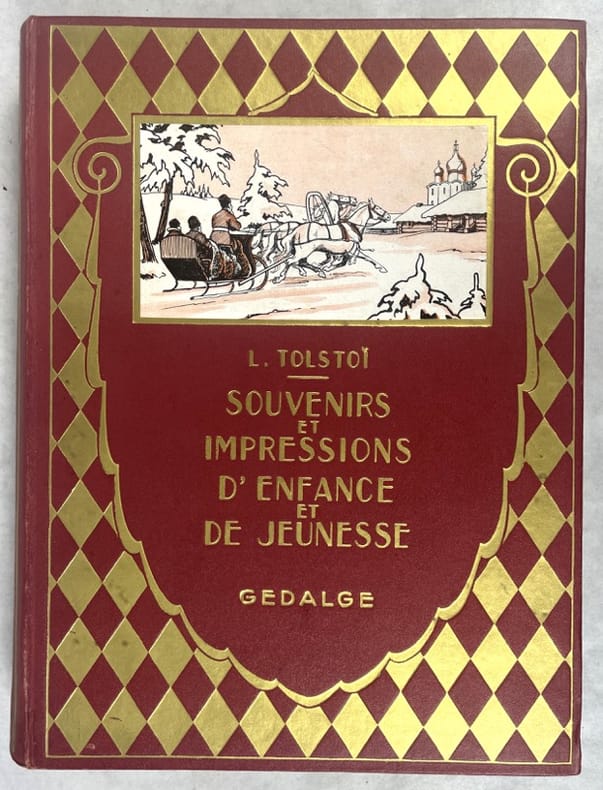 Paris, Gedalge 1936 In-4 32,5 x 23,5 cm. Cartonnage éditeur toile rouge orné d’un décor losangé or, report auteur & titre dorés sur le dos lisse et premier plat de couverture orné d’une vignette polychrome contrecollée, XVIII-378 pp., iluustré de 2 portraits de Tolstoï et de 43 compositions de J.Pierre Laurens, table des matières.