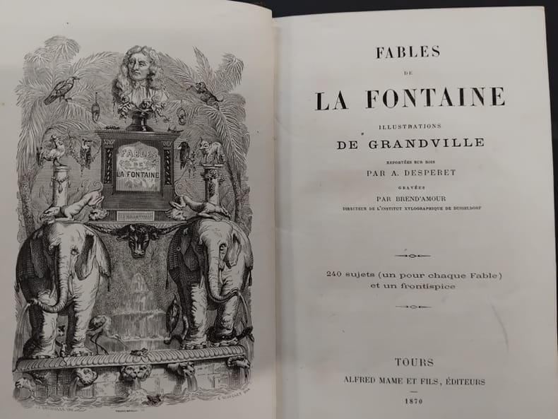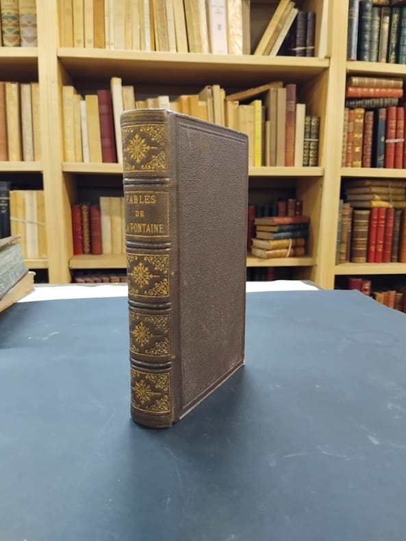 Mame 1870 In-12, demi-chagrin brun, dos à nerfs, caissons ornés, X- 512 p., 240 sujets un pour chaque Fable et un frontispice. Menus frottements. Très bon exemplaire.