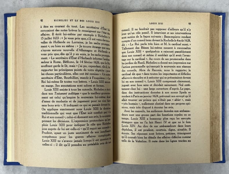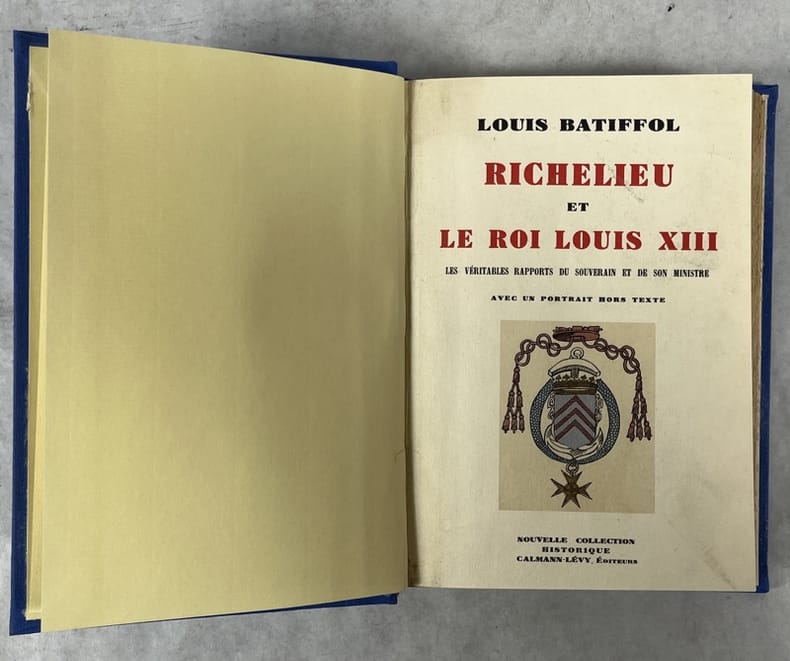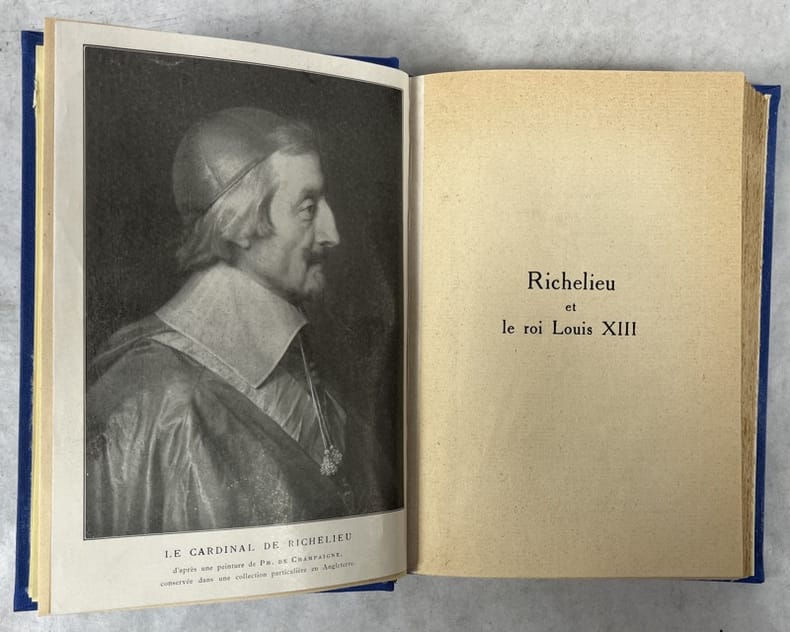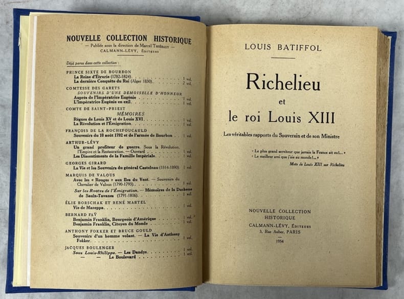 Paris, Calmann-Lévy, coll. « Nouvelle collection historique » 1934 In-12 19,5 x 12,5 cm. Reliure moderne toile bleu-roi, pièce de titre cuir noir, couvertures conservées, portrait de Richelieu en frontispice, IV-316 pp., table des matières. Exemplaire en très bon état.