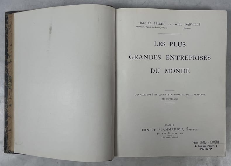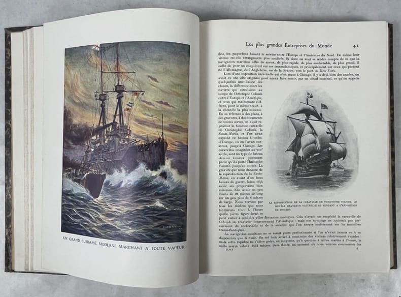 Flammarion Paris, Flammarion, sans date, vers 1900. In-4 carré relié plein cartonnage éditeur, plat orné d'une vignette contrecollée dans un encadrement doré, titre doré et noir. Tranches dorées. 386 pages, photos en noir dans le texte et planches couleurs hors texte. (450 illustrations et 13 planches en couleurs). Les grandes entreprises de l'Antiquité et les grands travaux modernes. Les constructions navales. Les ports. Les phares. Les grands canaux. Les grandes lignes de chemins de fer. Tunnels. Ponts et viaducs. Métallurgie et mécanique. L'électricité. Télégraphie sans fil. Les moteurs à explosion et l'automobile. L'aviation. Les distributeurs d'eau. Tours de Babel modernes. La mécanique au service de l'agriculture, etc. Bon état