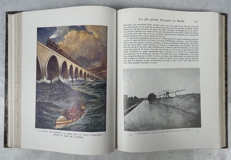 L’état du génie civil et de l’industrie au début du XXe siècle.Les Grandes entreprises de l'Antiquité à nos jours - Les Constructions navales - Paquebots géants et Navires de guerre - Les Ports. Leur construction, leur outillage - Les Phares et les Hautes Tours - Les Grands canaux - Les Grandes lignes de chemin de fer - Les Locomotives et le Matériel roulant des voies ferrées - Tunnels et Chemin de fer souterrains - Services postaux souterrains et autres - Ponts et Viaducs - Transporteurs et Transbordeurs - Métallurgie et Mécanique - L'Electricité, La Houille et la Transmission de la force à distance - Lignes télégraphiques aériennes et souterraines - Télégraphie sans fil - Les Moteurs à explosions et l'Automobile - La Navigation aérienne et l'Aviation - Puits et sources - Maisons monstres et Tours de Babel modernes - La Mécanique et l'Automobile au Service de l'Agriculture. Conclusion Bon état d’occasion