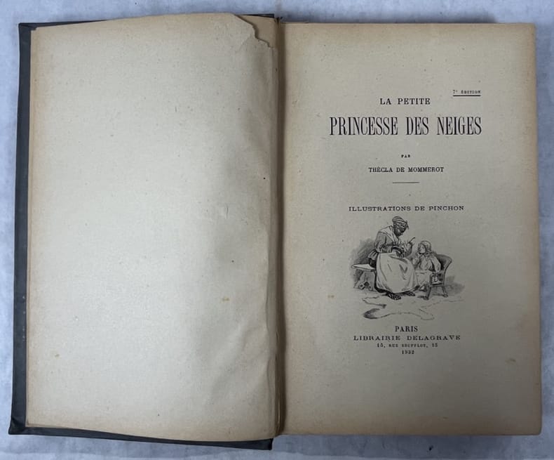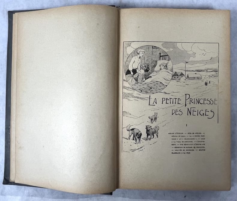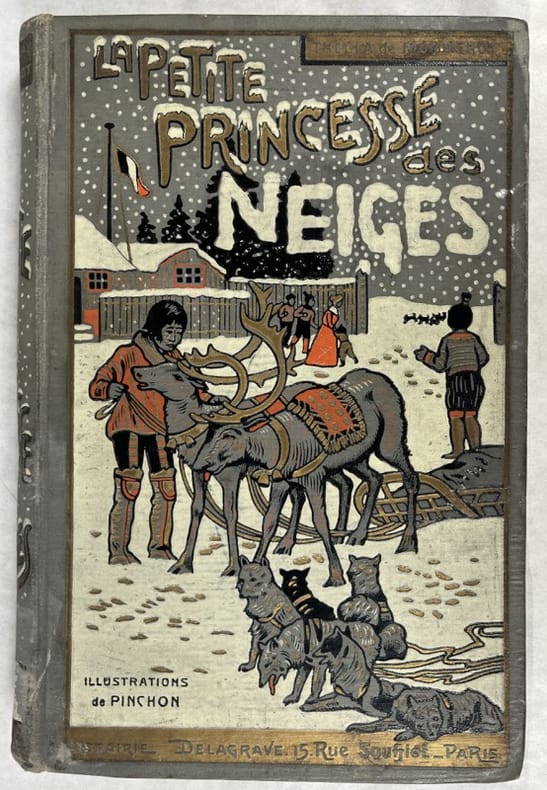 Paris, Delagrave 1932 In-4 27,5 x 17,5 cm. Cartonnage éditeur percaline grise, avec titre et décors dorés et en couleurs, décor polychrome 1er plat avec scène représentant deux cerfs attelés à un traineau à côté d'un attelage de six chiens, tête dorée, 240 pp. Illustrations en noir de Joseph Pinchon, le père de Bécassine., table des matière.