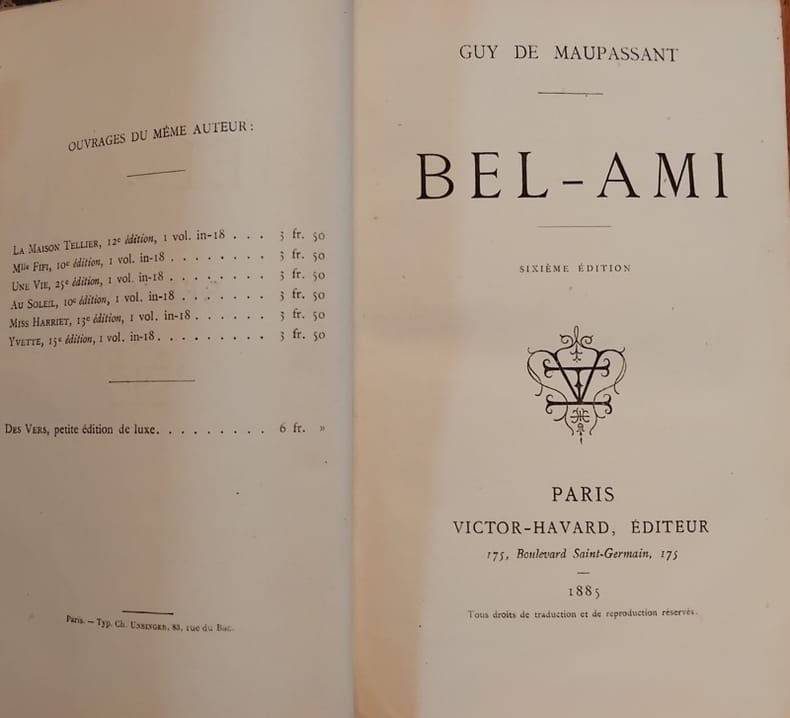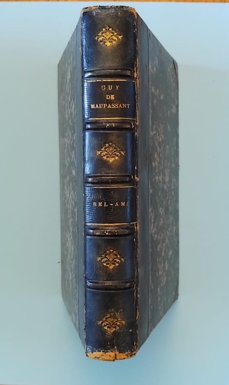 ''Le monde est une mascarade où le succès va de préférence aux crapules. Comme Flaubert, mais en riant, Maupassant disait de son personnage, l'odieux Duroy : " Bel-Ami, c'est moi." Et pour le cynisme, la fureur sensuelle, l'athéisme, la peur de la mort, ils se ressemblaient assez.'' Angles et coupes élimés. Légers frottements affectant le mors supérieur du premier plat. Papier légèrement oxydé. Du reste, bonne condition.