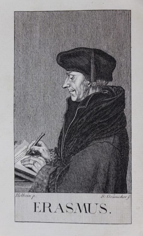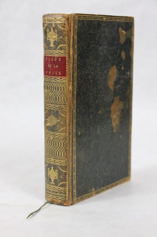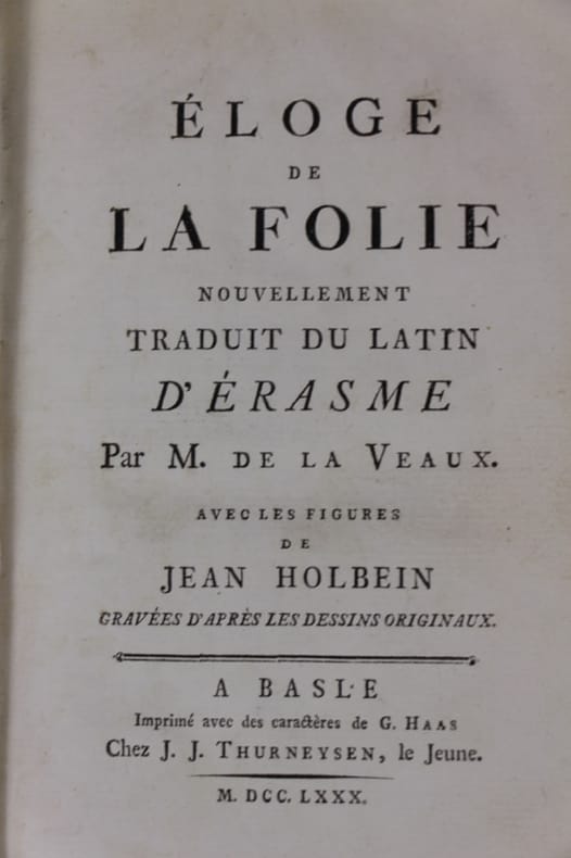 Bâle Thurneysen 1780 Bâle, J.J.Thurneysen, le jeune, 1780, XVI-392 pages avec 82 figures insérées dans le texte. Format: 15 x 22 cm. Accompagné du portrait d'Erasme en tête du vol. et d'un avertissement de l'éditeur suivi de la préface d'Erasme, adressée à Thomas Morus. Reliure moderne pleine toile avec pièce de titre en peau rouge, lettre dorées.
