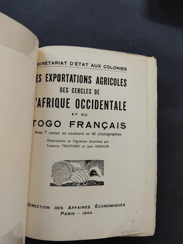 Les exportations agricoles des cercles de l'Afrique Occidentale et du Togo Français. Avec 7 cartes en couleurs et 40 photographies. Illustrations et vignettes dessinées par Suzanne Truitard et Jean Kerhor. (Paris: Ministère des Colonies, Direction des Affaires Economiques, 1944). [M.C.: Afrique noire, Afrique occidentale, A.O.F., AOF, Togo, économie, colonisation, colonies françaises]