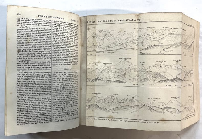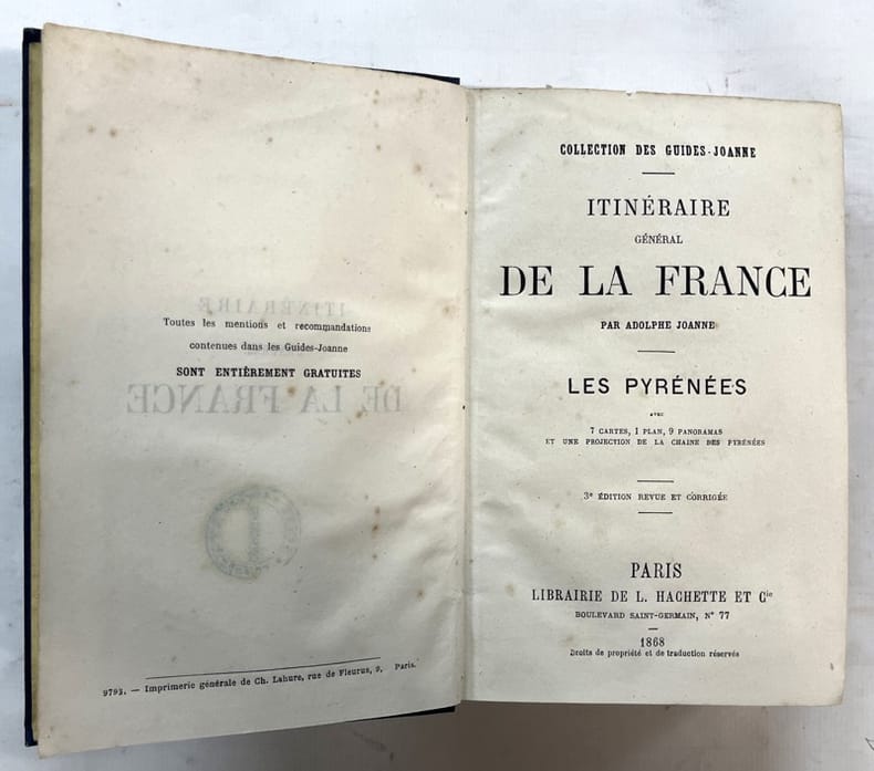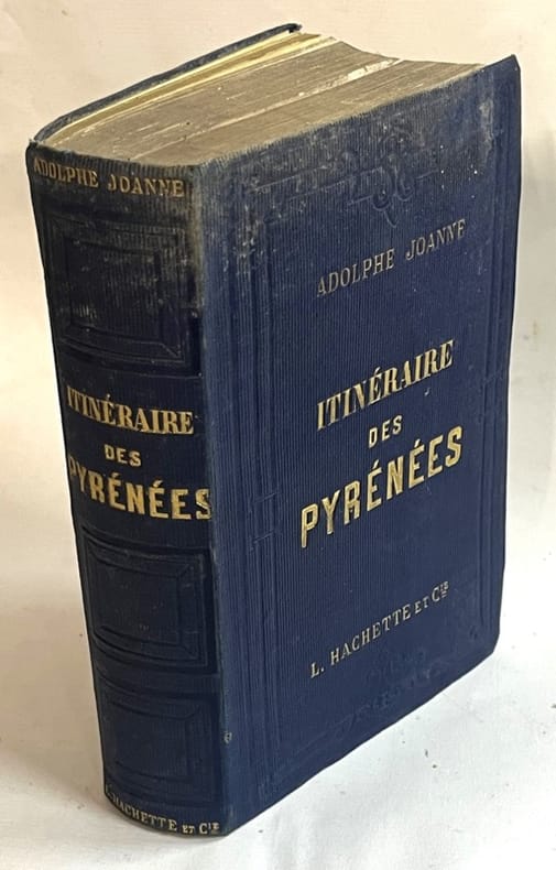 Paris, L. Hachette, coll. « Collection des Guides-Joanne » 1868 In-12 18 x 11,5 cm. Cartonnage éditeur percaline bleu-marine, auteur & titre dorés sur le dos et le premier plat de couverture, LXXIV-704-62 pp., 7 caertes, 1 plan, 9 panoramas eue projectionde la chaîne des Pyrénées, table méthodique.