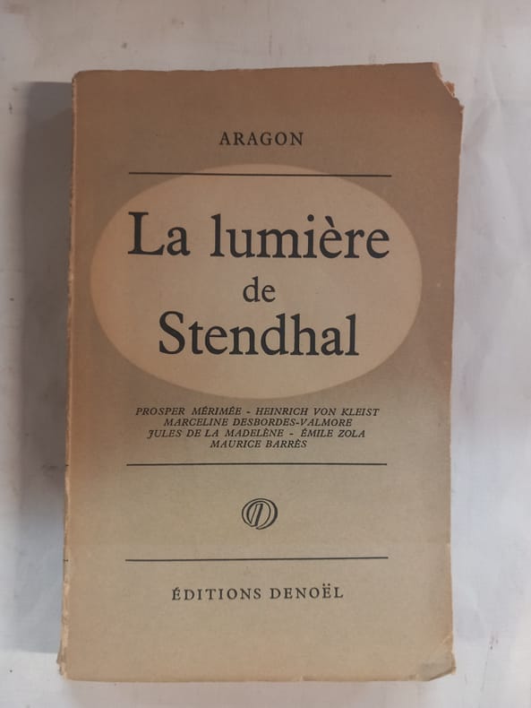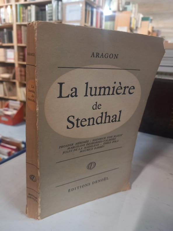 Paris, Denoël, 1954, in-8, 269-[3] pp, Percaline à la bradel, pièce de titre verte, couvertures et dos conservés, Édition originale. L'ouvrage a paru l'année où Aragon (1897-1982) prononçait sa conférence "Stendhal en une heure et quart" à l'École centrale du Parti Communiste Français. Il réunit quatre articles écrits pour les Lettres françaises entre 1948 et 1954 : le poète y explore les liens entre Stendhal et le réalisme historique. Suivent quelques pages sur Mérimée, Henrich von Kleist, Marceline Desbordes-Valmore, Jules de la Madelène, Zola et Barrès. Bon exemplaire du service de presse, enrichi d'un envoi signé d'Aragon au journaliste autonomiste breton Morvan Lebesque (1911-1970). Pages jaunies. Couverture rigide