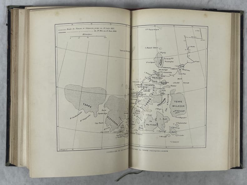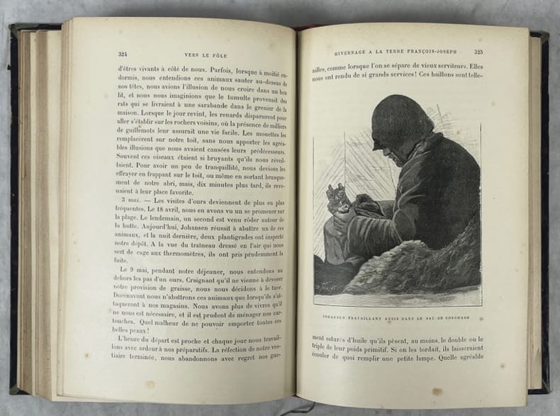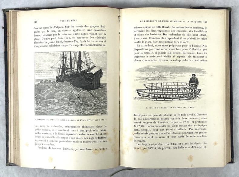 Portrait de l'auteur en frontispice et 200 illustrations in et hors-texte d'après les photographies et dessins de l'explorateur. "Parti en 1893, l'explorateur norvégien Fridtjof Nansen (1861-1930) se fait volontairement prendre par les glaces dans la mer de Kara. Mais en seize mois il ne progressera que de 360 miles. Avec son compagnon Johansen, Nansen part alors en traîneau vers le nord et atteint la latitude de 86° 14' le 8 avril 1895 : personne n'avait encore approché le pôle d'aussi près". Bon exemplaire malgré des rousseurs.