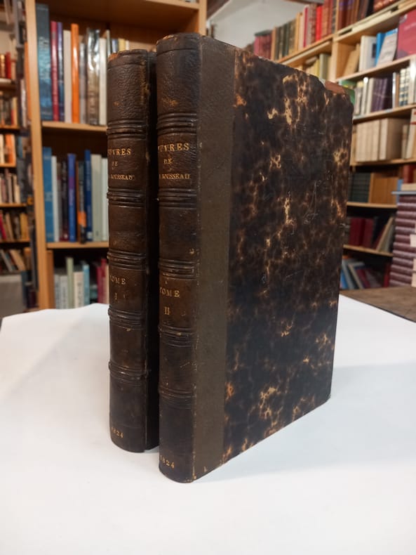 A Paris, chez Lefèvre, Collection des Classiques François - 1824 - xxxv, 419 et 363 pages.Ex Libris de la bibliothèque de Henri Beraldi. Portrait frontispice au T1.Très belle reliure plein maroquin à long grain citron, à la Duseuil, signée Bauzonnet. Large encadrement de filets dorés ornant les plats, fleurons angulaires. Dos lisse orné, pièces de titre et de tomaison maroquin noires. Tranches dorées. Filets sur les contre-plats. Aucun frottement. Rares rousseurs. Bel exemplaire. Parfait état. Format in-4°(25x17).Jean-Baptiste Rousseau, poète et dramaturge français. Fils d'un cordonnier, il reçut de Boileau la tradition du XVIIe siècle, et se fit un nom, dès l'âge de 20 ans, par son talent pour la poésie. Il suivit, comme secrétaire, le maréchal de Tallard à Londres. Revenu à Paris, il s'essaya dans le genre dramatique, et n'y réussit pas. Il attribua ses échecs au théâtre à des cabales dirigées contre lui, et, donnant carrière à son esprit satirique, il fit des couplets contre plusieurs hommes de lettres.