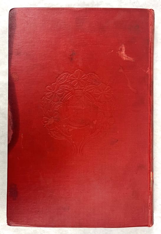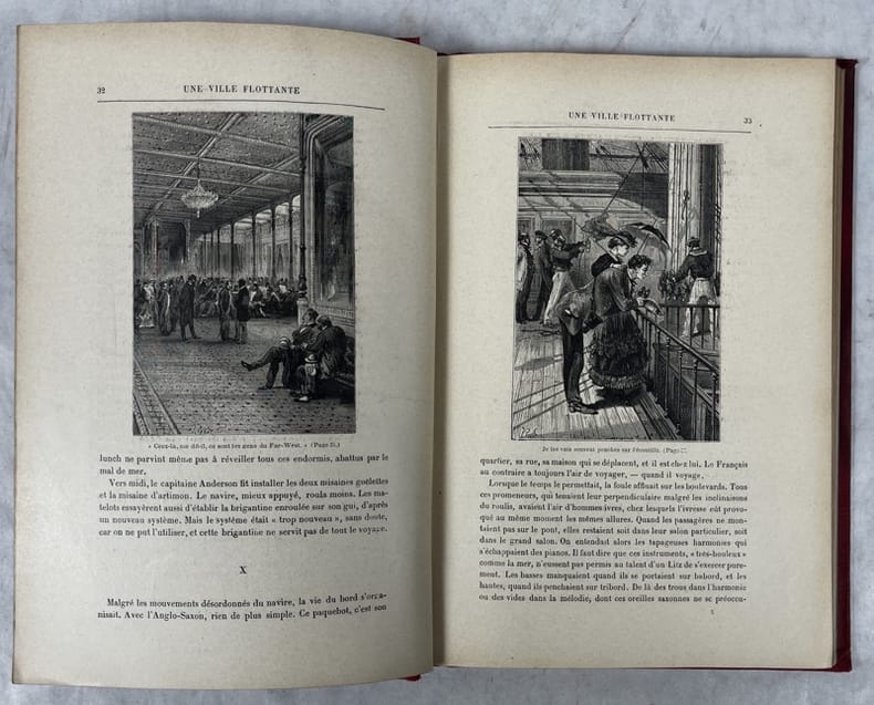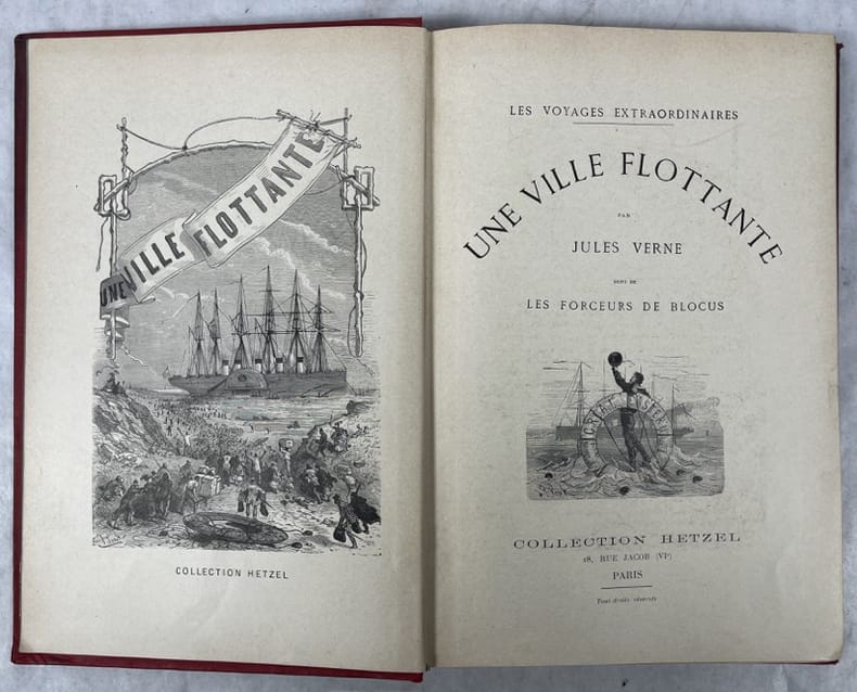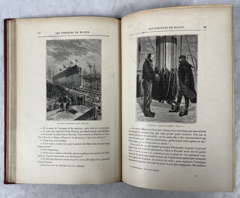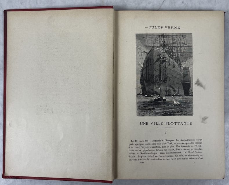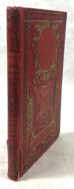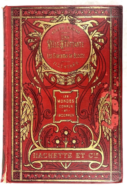 Paris, Collection Hetzel, coll. « Les Voyages extraordinaires » 1900 In-4 27,5 x 17,5 cm. Cartonnage éditeur percaline rouge, dos et plats ornés de motifs ressemblant à des ferroneries volutes & piques, titre est dans un dans un triple cercle doré et rouge décoré de points, tranches dorées, 316 pp., table des matières.