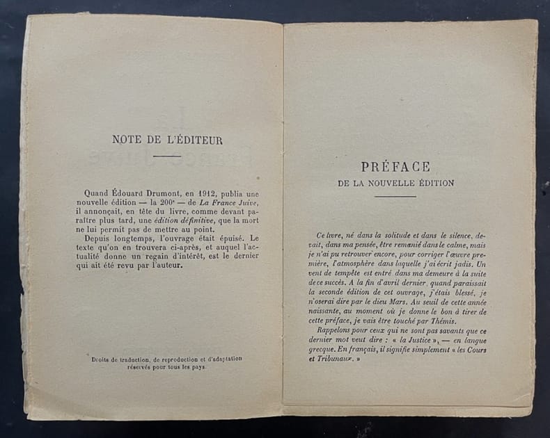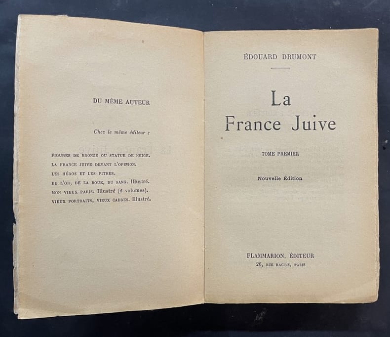 Quand édouard Drumond, en 1912, publia une nouvelle édition, la 200e, de La France Juive, il annonçait en tête du livre, comme devant paraître plus tard, une édition définitive, que la mort ne lui permit pas de mettre au point. Le texte présent est le dernier qui ait été revu par l’auteur. Bon état d’occasion
