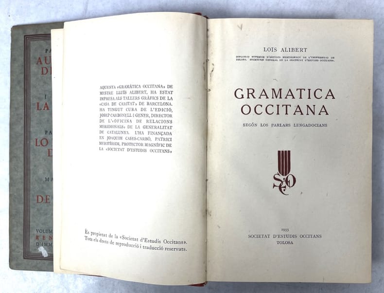 Tolosa, Societat d'estudis occitans, coll. « Collección pedagogica Ramon Vidal de Besalú » 1935 In-8 21,5 x 13 cm. Reliure éditeu toile rouge, sous jaquette verte, XXXIX-494 pp., notes bibliographie, table des matières. Exemplaire en bon état. Couverture poussiéreuse.